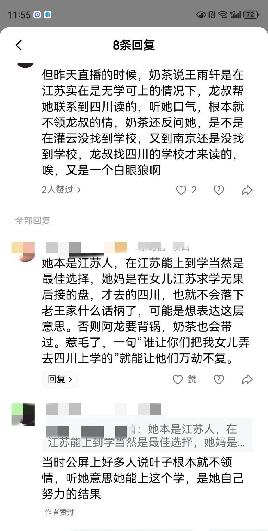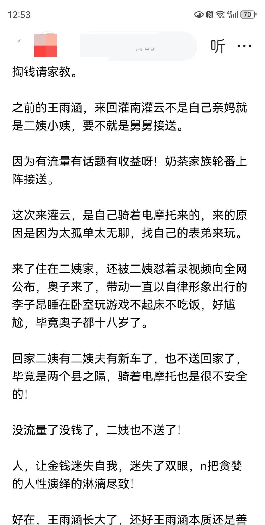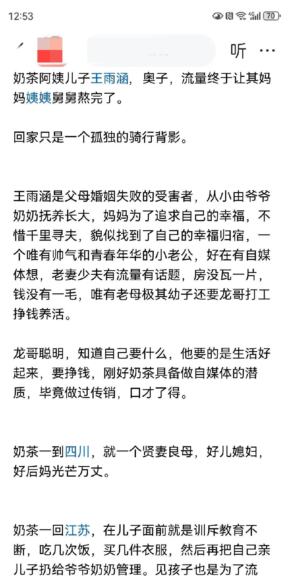刷到网友对奶总家族的剖析,入木三分。 奶总儿子曾经是她们家族的流量王,妈妈,舅舅,姨妈,几个账号轮番拍摄,谁都知道,只要视频里有他那天的收益就有保证。个个对他都好,车接车送,镜头随着他转动,捕捉每一个能引起争议的瞬间。现在网友全都反感他,拍他只有差评和流量,却变不了现,回家就只有电瓶车上落寞的背影。以前暑假要么奶总追去婆家看,扬州看儿子,现在去江苏都不再去拍他,网友问为啥不叫儿子去四川,奶总回复是孩子拒绝了不想去,然后匆匆结束话题,真实情况没人知道,他已经沦为一个弃子。 奶总女儿一直都有白眼狼的称号,原因就是她自己亲爹都不认。结果昨天晚上直播时,聊到她能在成都读书,龙哥给她找学校,找补课老师,(这些都有视频作证)最终单招上了个民办航空大专。粉丝都以为她会很感激龙哥,结果她的回复让人大跌眼镜,她并不认为应该感谢龙叔,觉得这一切都是她自己努力的结果。亲爹家养她到初中毕业,继父为她操心办了一堆事,她却都不领情,她的这番言论看得网友错愕,这不就是妥妥的白眼狼吗?