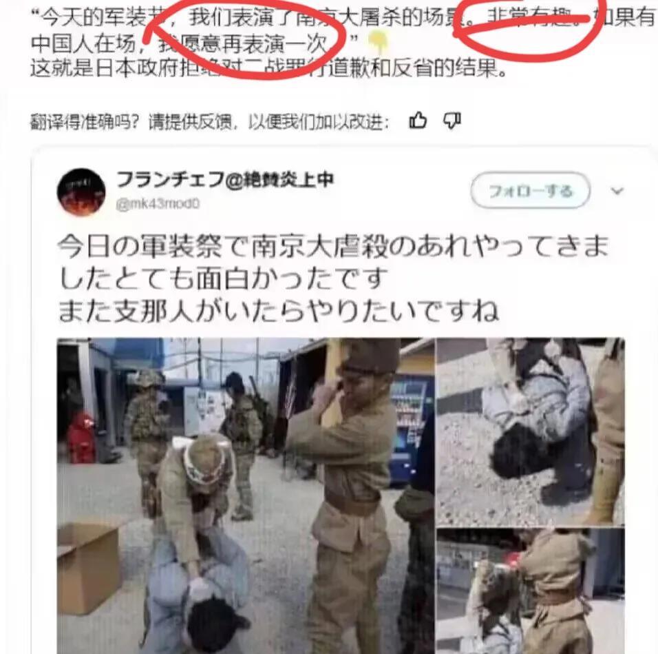 看完这两个日本人的发文,我不信能有人忍住不爆粗口! 一个污蔑我们,认为中国捏造南京大屠杀事实,并强调相信南京大屠杀的人是令人悲哀的! 一个是在日本军装节,街头表演南京大屠杀场景,也就是街头表演杀中国人,表示如果中国人在场观看愿意再次表演! 写完这两段描述,我情不自禁握紧了拳头。跟这些人提“中日友好”还不如“对牛弹琴”,我们还是太仁慈了! 我们让他们承认历史,他们说打人的都忘了。我们让他们反省自己,他们说“愿意再次表演屠杀中国人”,已经没有基本的良知和底线了!不能再这么忍下去了!