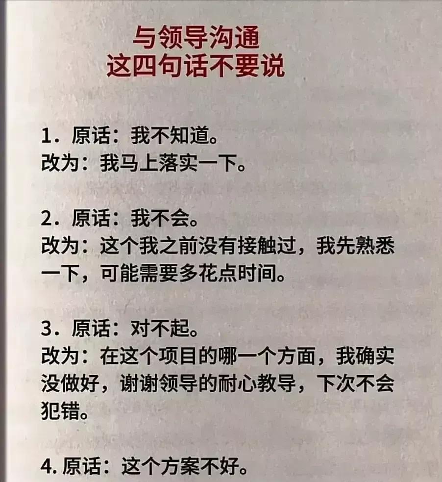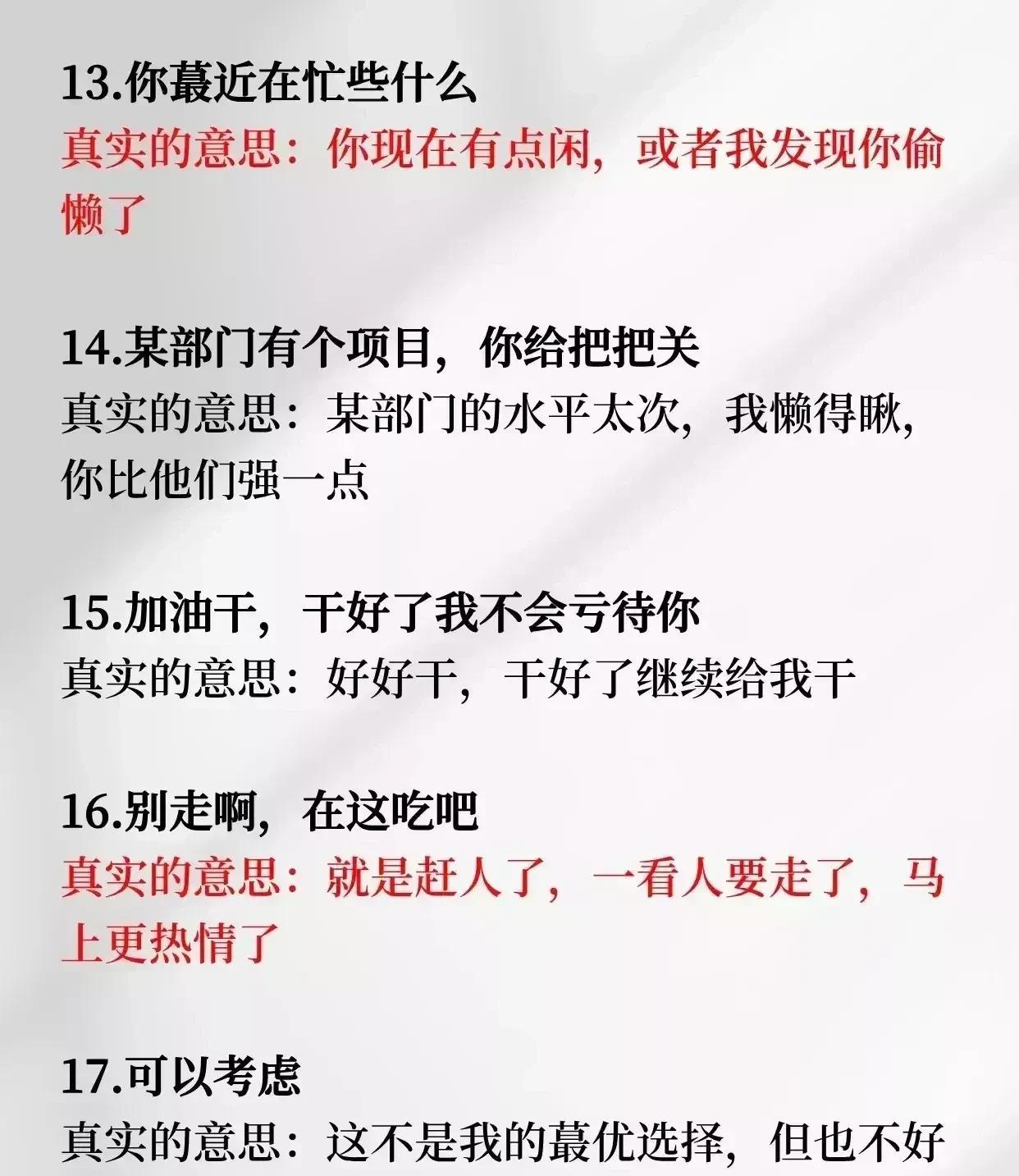 工作30年才知道,原来职场领导早把办事黑话办事兵法运用的炉火纯青了,你以为是关心,实际你快凉了,尤其是下面这些领导黑话,看懂的都是牛人,不愧是职场摸爬滚打出来的智慧结晶,值得反复背诵! 在职场中,领导的话语往往蕴含着深意,那些看似平常的关心和评价,可能隐藏着对你工作表现的真实看法。只有读懂这些黑话,才能在复杂的职场环境中明辨方向,做出正确的应对。 盘点一些具体的领导黑话: - “你要和同事多沟通多亲近”,真实意思是最近有人告你状了。 - “你这个人很老实”,真实意思是你有点缺心眼,不够灵活,不懂变通。 - “这个岗位很锻炼人”,真实意思是这个岗位会累死人,你要有心理准备。 - “我说句公道话”,真实意思是我就是站他那边的。 - “我有一个朋友”,真实意思是就是我自己。 - “你很有个性”,真实意思是你锋芒毕露,该收敛了。 - “啊这个我也不太清楚”,真实意思是能不能别烦我,我知道也不想说,能躲多远躲多远。 - “我不喜欢麻烦别人”,真实意思是别人包括你,也别来麻烦我。 - “最好今天完成”,真实意思是需要今天完成。 - “这事你直接汇报给大领导吧”,真实意思是这是个烫手山芋,我不想介入。 - “都是自己人,别客气”,真实意思是我就随便客气下,你可别当真。 - “这件事回头再说”,真实意思是你这个想法不靠谱,还是pass吧。 - “你最近在忙些什么”,真实意思是你现在有点闲,或者我发现你偷懒了。 - “某部门有个项目,你给把把关”,真实意思是某部门的水平太次,我懒得瞅,你比他们强一点。 - “加油干,干好了我不会亏待你”,真实意思是好好干,干好了继续给我干。 - “别走啊,在这吃吧”,真实意思是就是赶人了,一看人要走了,马上更热情了。 一些领导黑话表面关心,实则警示!打个比方,当领导说“你要和同事多沟通多亲近”,这很可能意味着最近有人向他反映了你的问题,你在团队中的人际关系可能出现了危机。 这时候,你需要反思自己在与同事相处过程中是否过于自我,缺乏有效的沟通和协作。主动与同事交流,了解他们的想法和需求,积极参与团队活动,改善与同事的关系,才能避免进一步的负面评价。 还有“你这个人很老实”,这句话听起来像是在夸你,但实际上是在暗示你不够灵活,缺乏变通能力。 在工作中,有时候需要根据实际情况做出调整和创新,过于死板地遵循规则可能会影响工作效率和成果。你需要学会在坚持原则的基础上,灵活应对各种变化,提高自己的应变能力。 有些领导黑话表面看似鼓励,实则另有深意!就比如这句话,“这个岗位很锻炼人”,领导说这句话时,可能是在提醒你这个岗位工作压力大、任务艰巨,需要你做好充分的心理准备。 不要仅仅看到“锻炼人”这三个字,而要深入思考这个岗位的挑战和机遇。提前制定工作计划,提升自己的专业技能,以积极的心态迎接挑战,才能在这个岗位上有所收获。 还有“你很有个性”,这往往是领导对你的一种委婉批评,暗示你过于张扬,不懂得收敛自己的锋芒。在职场中,团队合作至关重要,过于突出自己的个性可能会影响团队的和谐氛围。 你需要学会尊重他人的意见,与团队成员保持良好的沟通和协作,在适当的时候展现自己的能力,而不是一味地追求个性的张扬。 还有一些领导黑话具有暗藏玄机的工作安排,比如“这件事你看着办”,这句话看似是领导对你的信任,实际上是给你施加了巨大的压力。领导的真实意思是这件事交给你了,但绝不能出错,否则你将面临严重的后果。 对于我们这些普通打工人,在接受这样的任务时,你需要仔细分析任务的要求和目标,制定详细的工作计划,与领导保持密切的沟通,及时汇报工作进展,确保任务能够顺利完成。 “这事儿有点难办啊”,当领导说出这句话时,很可能是在暗示你需要给予他一定的好处或回报,他才会帮助你解决问题。 这时候,你需要谨慎处理,既要保持原则,又要灵活应对。可以尝试与领导沟通,了解他的具体需求,看看是否有其他合法合规的方式能够解决问题。 在职场中,读懂领导的黑话是一项重要的生存技能。通过深入理解这些话语背后的含义,我们能够更好地把握领导的意图,调整自己的工作策略和行为方式。还有一些办公室阴招,可以不用,但一定要懂! 比如被同事使唤时,低情商回应是“我现在没空,你先自己做吧”,高情商回应是“好啊,那你今天可要请我吃饭了”,黄金公式为不明确拒绝 + 要报酬。 同时,我们也要保持清醒的头脑,不被表面的话语所迷惑,建议那些初入职场的新人,多看看办事兵法,别再傻傻地只听领导表面意思了,不然很容易在职场走弯路呀。这些领导黑话办事兵法可以不用,但一定要有所了解,办事兵法办事讲究计谋,看透人性,学会为人处世,办事分寸悟透了,能让你在职场上左右逢源,事业蒸蒸日上! 办事兵法 权衡博弈书办事讲究计谋看透人性学会为人处世办事分寸