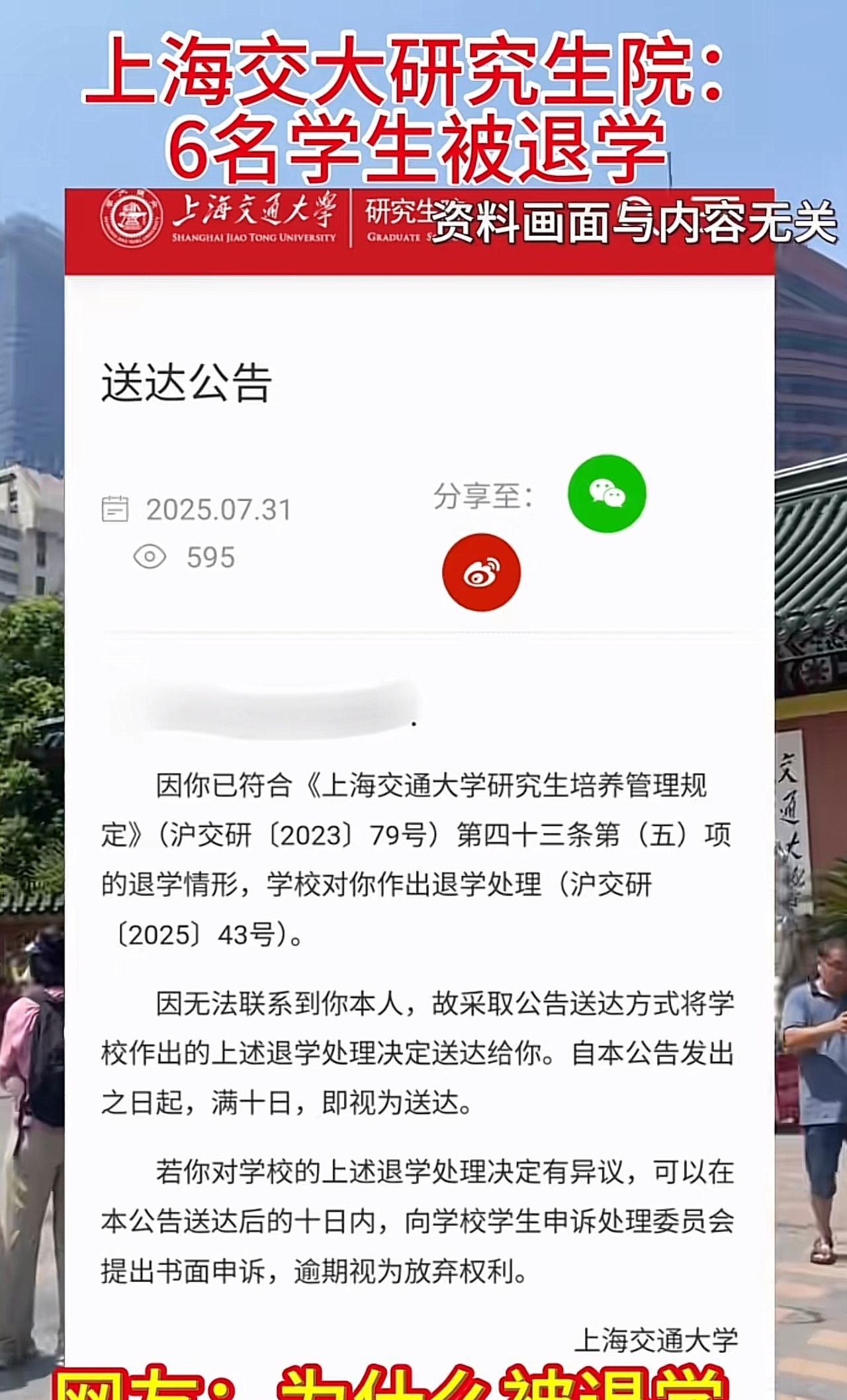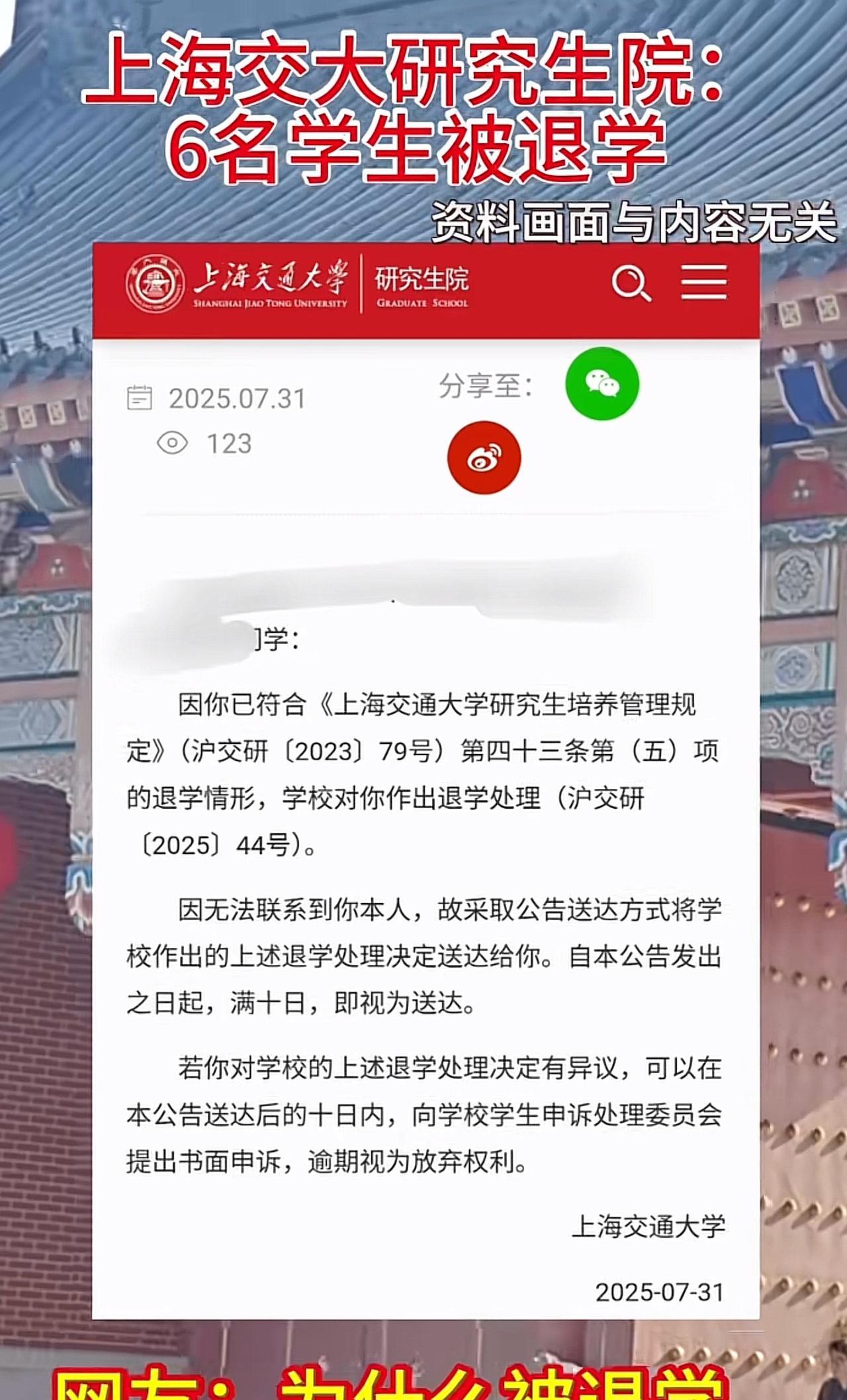 #上海交大6名研究生被退学#“这极其少见!”近日,上海交通大学研究生院公布6名研