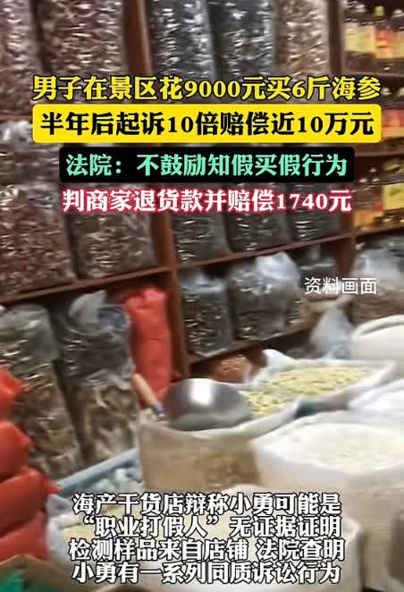 厦门,一游客在鼓浪屿豪掷9000元买6斤海参,当场带走仅2斤,余货直寄老家。半年后,游客突然手持外省检测报告杀回,揪住“三无产品”标签漏洞,索赔10万。游客没有选择与商家协商,而是径直将店家告上法院。案件审理时发现男子曾用同样原因起诉索要10倍赔偿49次,法院判决支持男子理赔,但结果却让人意外! 职业打假有利有弊,怎么样能平衡呢?既有效威慑商家,又不能让买假职业化,我认为可以统一判决思路,职业打假目的是牟利,不是社会责任感!十倍罚款支持,但同时若认定是职业打假,可以认定不当得利!没收十倍罚款的百分之九十!没有了利润诱惑,职业打假自然消失,真正的受害消费者权利仍然受到保护。 该法应重新修改了,对所谓职业打假人其购买商品的目的是索取高额赔偿金,实属敲诈勒索,全国法院各判各的不统一,造成某些人钻空子利用法律漏洞牟利。坚决支持当地法院的公正判决。 法院不支持知假买假,但是商家知假卖假如何严惩呢?借鉴国外经验,让知假卖假的巨额罚没、吊销执照、破产关门、严惩不贷、重拳打击,这样才能遏制知假卖假的发生! 大家对此事有何看法?
