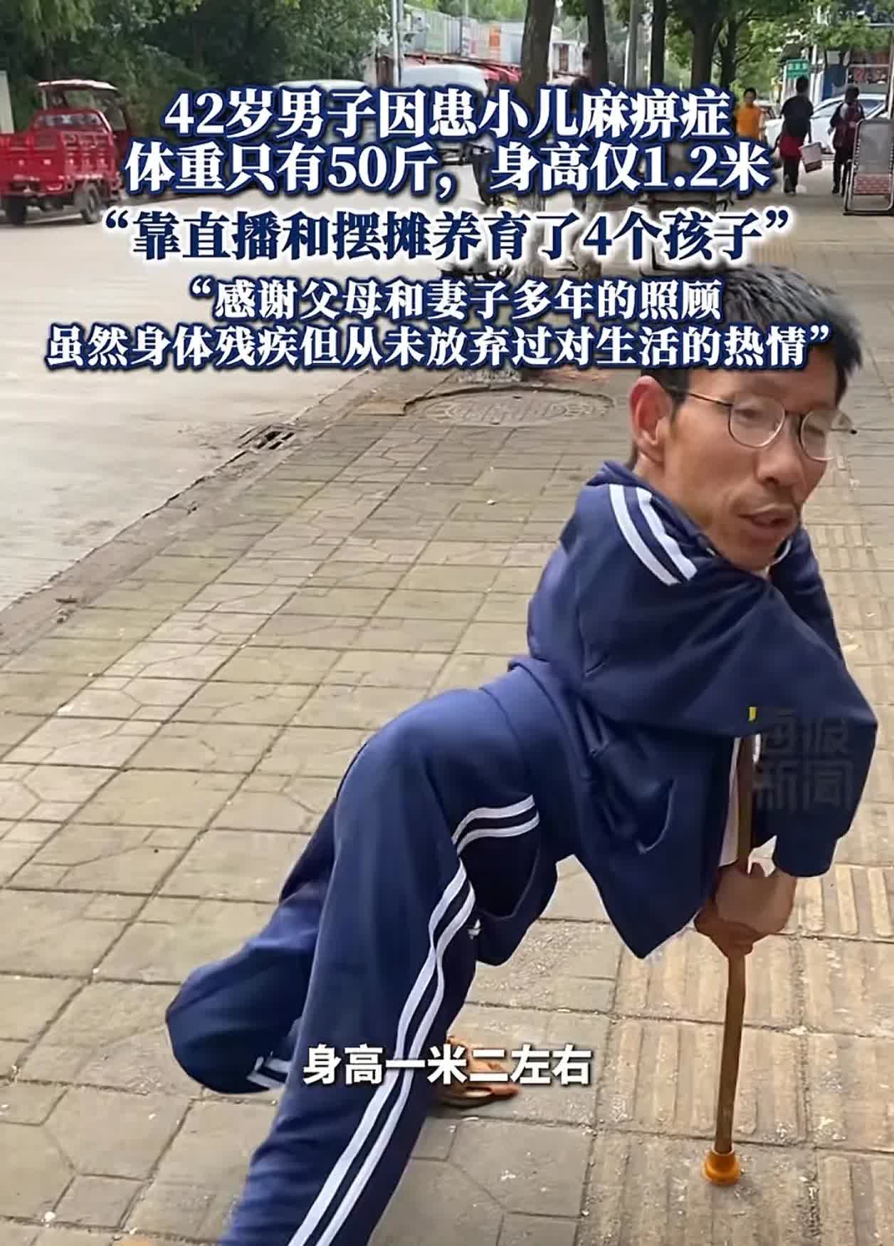 残疾父亲和智力不全的母亲生了四个儿女。 据了解,这名男子从小患有小儿麻痹症,身高仅1.2m,体重只有50斤,平时靠直播和摆摊养活四个子女(3个女儿1个儿子),好在大女儿已经上大学了。 正常人生一个孩子都已经感觉亚历山大,而这名男子在自身条件已经那么艰难的情况下,还孕育了四个子女,该说是父母的伟大呢?还是不负责任呢?就没有想过孩子以后该怎么办? 我真的觉得,要是自身残疾,罕见病之类的。真的不能要孩子。不是要剥夺你们的幸福。 而是对孩子来讲太不公平了,孩子是无辜的,而且还生了四个。 除非你有的是钱,可以在经济层面上补足。不然孩子的成长环境太难了。孩子还有可能要遭到别人的嘲笑要遭受白眼,大家觉得对吗?