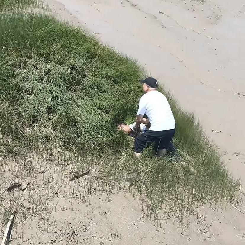 宁波慈溪一名男子与好友赶海,途中不明原因脸朝下晕倒在淤泥中,身体不停抽搐,眼看着就要窒息身亡。 命悬一线之时,一名来自陕西西安的男子(下面照片中戴帽子男子)去慈溪表弟家玩,正好这时看到趴在淤泥里抽搐的人。救人男子二话不说赶紧脱鞋跳下去,把抽搐人的脸从淤泥里拉出,并把他嘴里和鼻子里的淤泥抠出,让他呼吸。 与此同时,岸上救人男子的表弟在边上呼唤着晕倒男子的同伴,同时还引来了附近的人,有熟悉地方的人帮忙打了120。 男子同伴也赶来了现场,与救人的男子一起用水给男子清洗口鼻。120人员很快也赶到了现场,男子被众人抬上担架,送上了救护车。 据晕倒男子同伴讲述,男子没吃饭就出来赶海了,加上当时天气很热,这也许是导致男子突然晕倒的主要因素。 如果不是这两名陌生男子路过,刚好看见,或者晚个两分钟,人就没了。