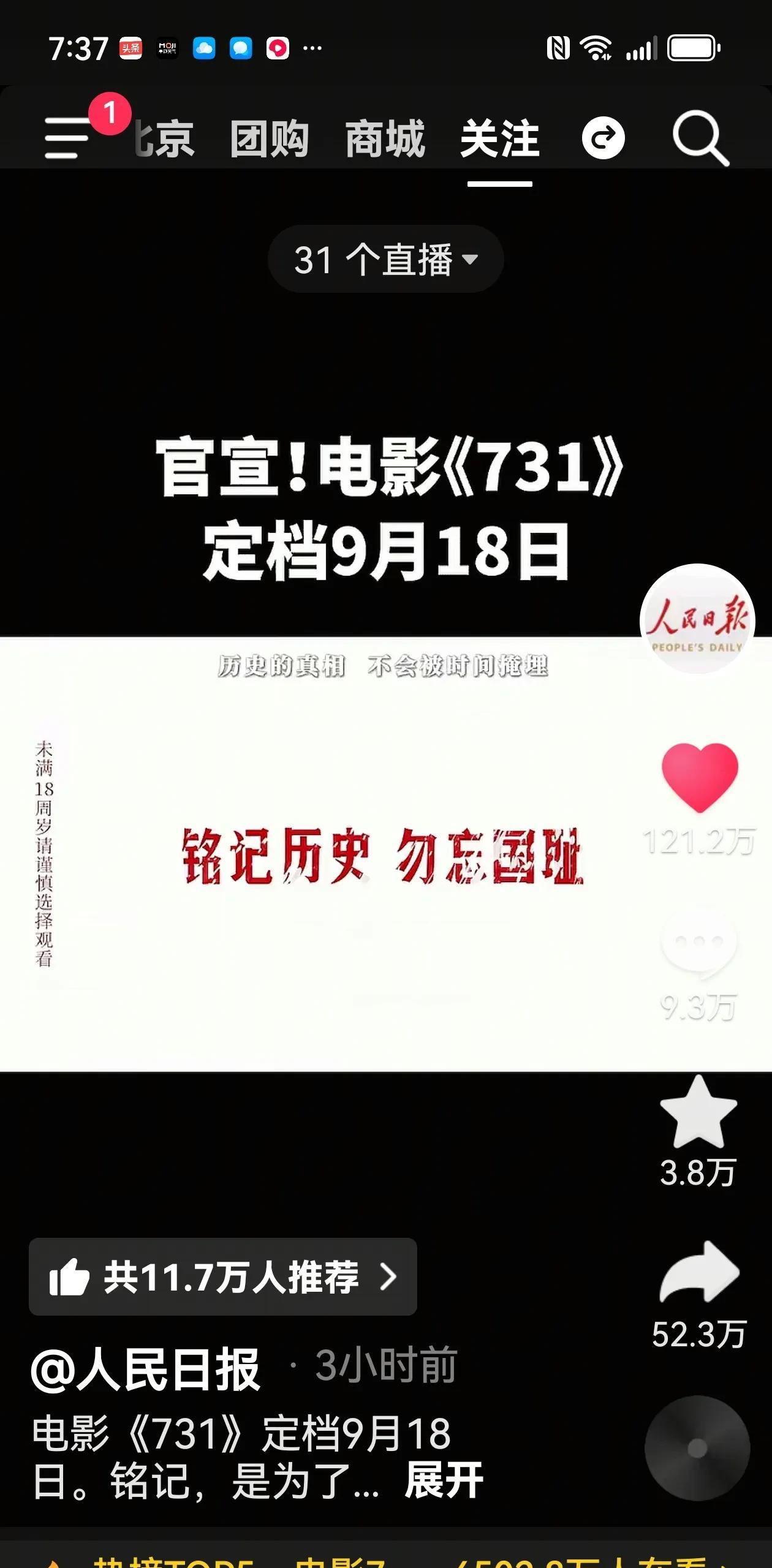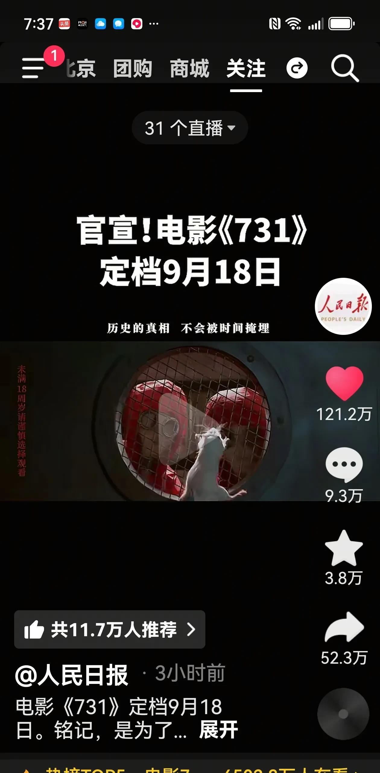 有没有和我一样的,看见电影《731》定档9.18那天上映,瞬间眼就泪流下来了。 铭记历史 勿忘国耻!