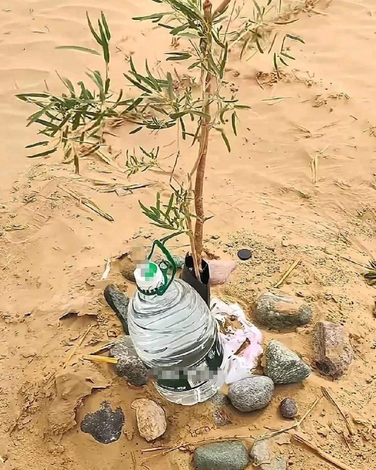 沙漠里了种的树苗,每棵树都有一桶水。这样是让这些树苗渴了自己拧开喝吗?
