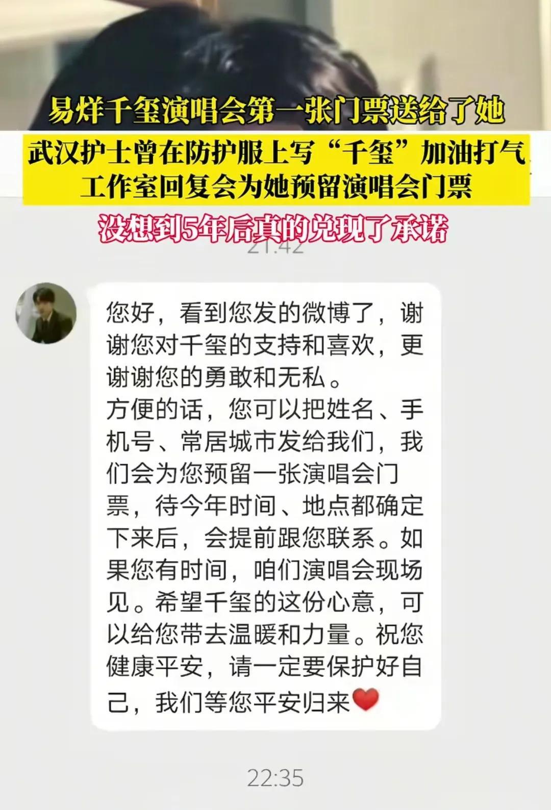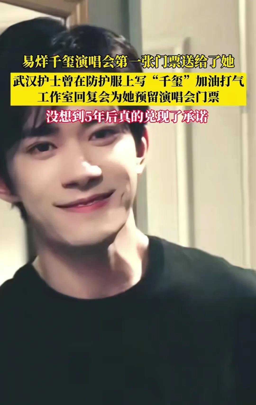 5年前,湖北武汉,1护士在防护服上写下‘干玺’加油!5年后,易烊千玺上海演唱会,为她送上前排座位!340万人抢票的盛况下,这份跨越5年的承诺,让全网泪奔! 来源:红星新闻 2020年初,武汉被疫情笼罩。无数医护人员冲在一线,为了使命守护着无数人的生命。 武汉一三甲医院,有位赵护士,和同事奋战在抗疫一线。 她们身着防护服,连续工作十几个小时。 赵护士的偶像是易烊千玺,平时不但用偶像的歌声为自己打气,还在防护服背面,写上“干玺”,旁边还画上了加油的符号。 这个画面被同事拍下来,把照片传到网上,成为那个寒冬里一抹暖流,无数人被那份热爱与乐观打动。 意想不到的是,易烊千玺也看到了这个视频。还私信她,鼓励她,保护好自己,还让她把联系方式留给他,等千玺开演唱会进,会邀请她参加。 这句承诺,穿越屏幕,温暖了赵护士和许多医护人员的心,也被亿万观众见证。 谁知,疫情让演唱会延期,这一延就是5年。 都以为没人记得当初的约定,赵女士的微博早就停更了。 然而,在2025年7月5日,赵护士手机上收到一条特别的信息。 赵护士点开一看,瞬间愣住了,激动地几乎要跳起来! 信息是邀请她参加易烊千玺上海的演唱会,并预留了前排的座位。 时隔5年,偶像和他的团队,他们来兑现当初的承诺来了。 赵护士激动得几乎说不出话,反复确认,是真的!这张演唱会门票,可不是花钱就能买来的,这场演唱会座位有7309个,却有340万人在抢,可谓一票难求! 8月2日,上海演唱会现场,气氛热烈,场面火爆。 赵护士手持印有专属纪念字样、位置在内场第二排VIP区门票,坐上属于自己的座位。 这个位置视野极佳,舞台近在咫尺! 当演唱会开始,灯光闪耀,易烊千玺出现在舞台上,她无比激动,挥舞着荧光棒,含着泪看完整场演出,久久难以平静。 赵女士看完演唱会,还在幸福地回味,她是2017年开始喜欢易烊千玺的歌,当听说千玺要开演唱会,她就预感到会实现愿望,当成为现实,她觉得一切都值了! 这份心意并未止步于一张门票。 当晚,每一位到场的观众,都收到了一份精心准备的伴手礼,有演唱会主题帆布袋、定制荧光棒套装、印有温暖插画的纪念相册日历。 赵女士的这段可贵的经历,是见证她青春,与那段特殊时期记忆的双重见证。 五年,说长不长,说短也不短,足以让很多人忘记一个随口说出的承诺。但易烊千玺和他团队记得,并且在一个340万人抢票的舞台上,为那位白衣天使留了一个好位置。 那张VIP门票,是对她当年勇气和乐观的致敬,是对所有平凡英雄的无声礼赞。 这个故事打动我的,不是偶像的光环,而是那个过去5年、不忘初心的承诺。 活该易烊千玺这么火,能够成为最年轻的影帝,当之无愧! 无论这个世界多么喧嚣,总有一些承诺会被兑现;无论星光多么璀璨,总有一些动人的星光,值得被人们记住。 那么,这个关于承诺与守护的故事,哪个瞬间戳中你了? #易烊千玺演唱会#