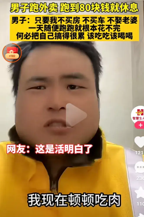 这位小伙活的太通透,男子跑外卖,每天跑80元就休息,男子说只要我不买车不买房,不要老婆,一天随便跑跑都花不完。