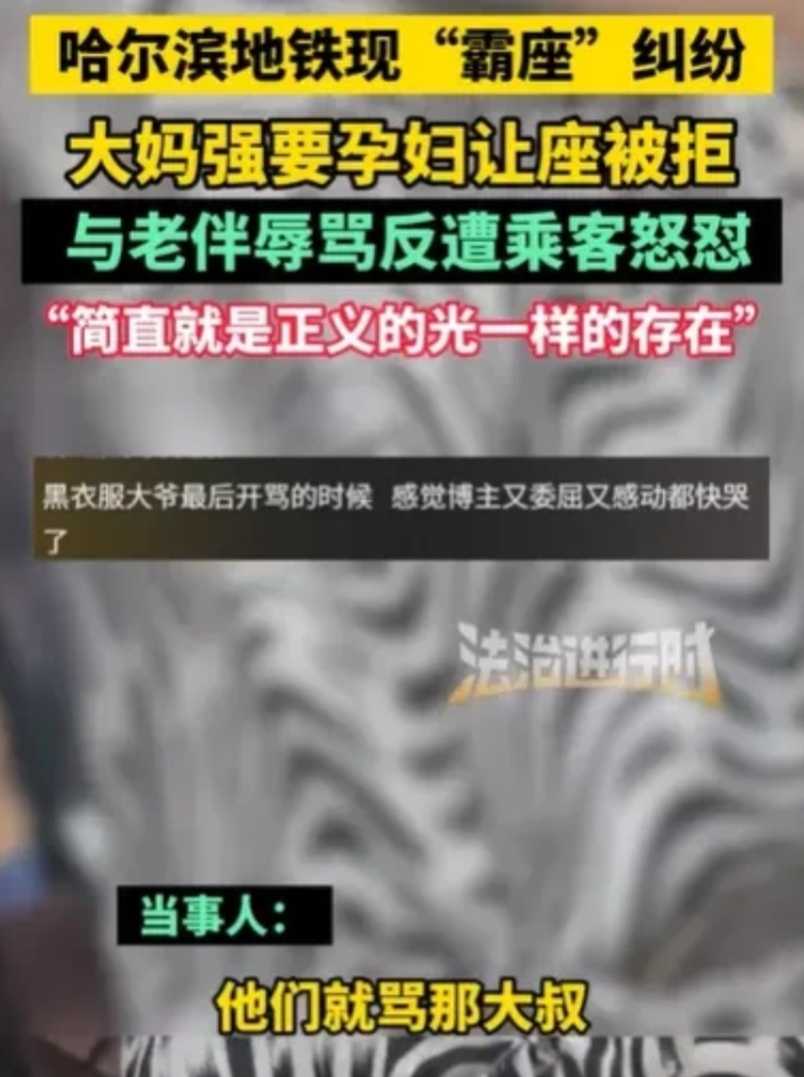 黑龙江哈尔滨,女子怀孕了,坐地铁时,正好有位置,结果上来了一对大妈大爷,大妈要怀孕女子让座,女子说自己怀孕了不能让,大妈就骂女子,旁边的人看不下去,就给大妈让座了,结果那位大爷心里不舒坦了,就站在一旁骂怀孕女子,女子很委屈,就在这时,一个正义的声音出现了。