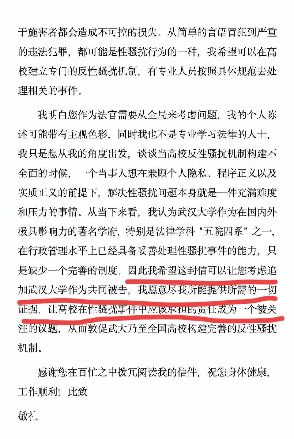 天呢?不敢相信,武汉大学也成了杨同学的被告,杨同学毕业后竟然把母校和肖同学一起告了,看了她写给法官的控告信,我惊呆了,在我的认知里,人都是懂得感恩的,感恩父母,感恩老师,学生状告学校真的很少见,事情发生后,学校惩罚了肖同学,对杨同学进行了特别的保护,个人信息没有大肆泄露,肖同学家属来访时,书记和老师对她做了很好的保护,从事件发生到毕业,武大心理咨询老师和辅导员都给了她莫大的安慰和鼓励,顺利毕业并保研,按理说,她应该感激才是,想不到她恩将仇报,一纸诉状把自己的母校也送上法庭,学校刚开始想化解矛盾,消除影响,私下解决错了吗?杨同学不考虑后果的公之于众,扩大了影响,升化了矛盾,外媒参与了,在学校的迁就下,杨同学越发得寸进尺,毁了学校也毁了自己,可悲可叹……