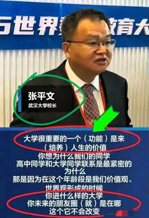 武汉大学,张校 长发声了 平心而论,讲得是真好 武大校长一句“大学朋友圈决定未来”,火了俩月还在发酵,这事你品出点啥? 有人说这是赤裸裸的圈子论,把大学变成了人脉交易所;也有人觉得戳破了现实,毕竟同窗资源确实藏着机会。但吵来吵去,核心早跑偏了——大学真正的“圈”,不该是标签堆砌的名利场,而该是让年轻人敢质疑、能思辨的磁场。 从小学的规矩到中学的方向,价值观本就是条长线,大学该做的是帮人把零散的认知串成绳,而不是圈块地说“进了这就得信这套”。网友骂官僚也好,挺校长也罢,其实都在纠结同一个问题:咱们的大学,到底该先教做人还是先教“混圈”? 或许真正的教育魅力,从来不是谁规定一套标准价值观,而是让人有底气在任何圈子里,都能守住自己的坐标系。你觉得,大学最该给学生的“隐形资产”,究竟是人脉网还是定盘星?