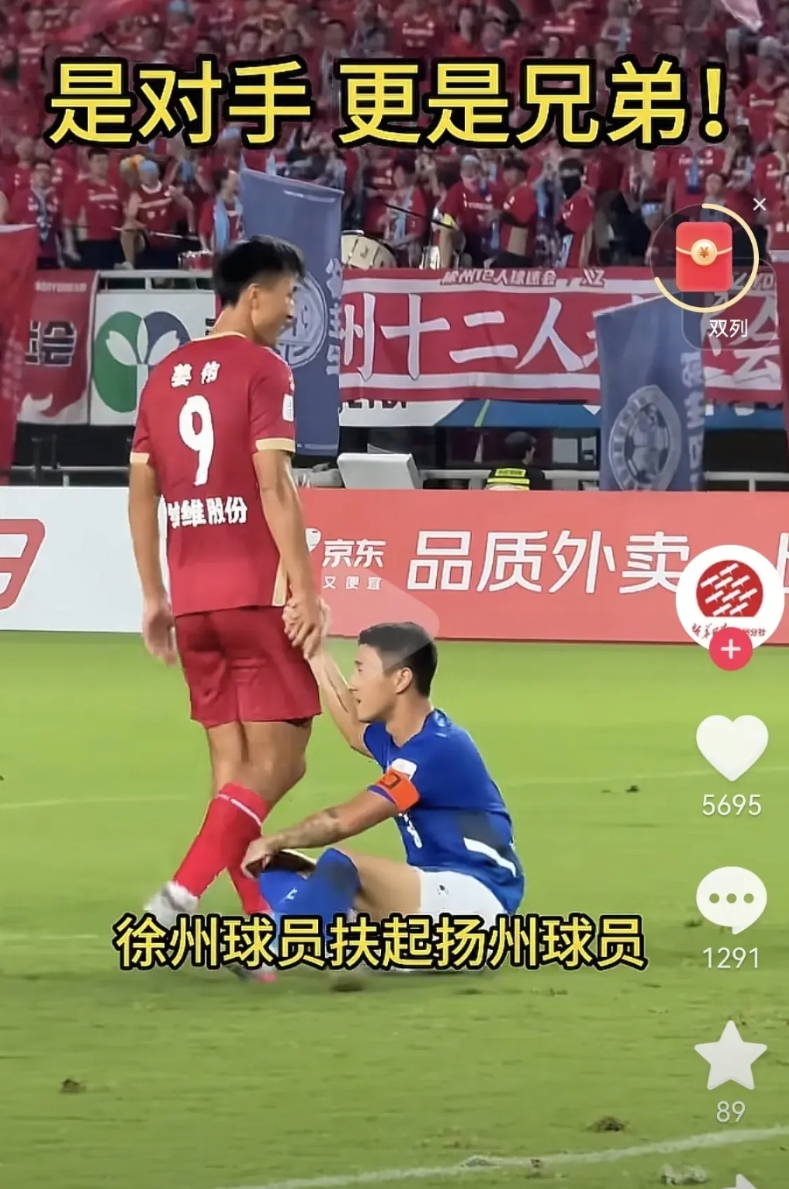 就拿徐州主场对阵扬州这场比赛来说,赛场上徐州队队员姜维主动去扶扬州队队长,两人携手前行,这哪像对手,分明就是兄弟!