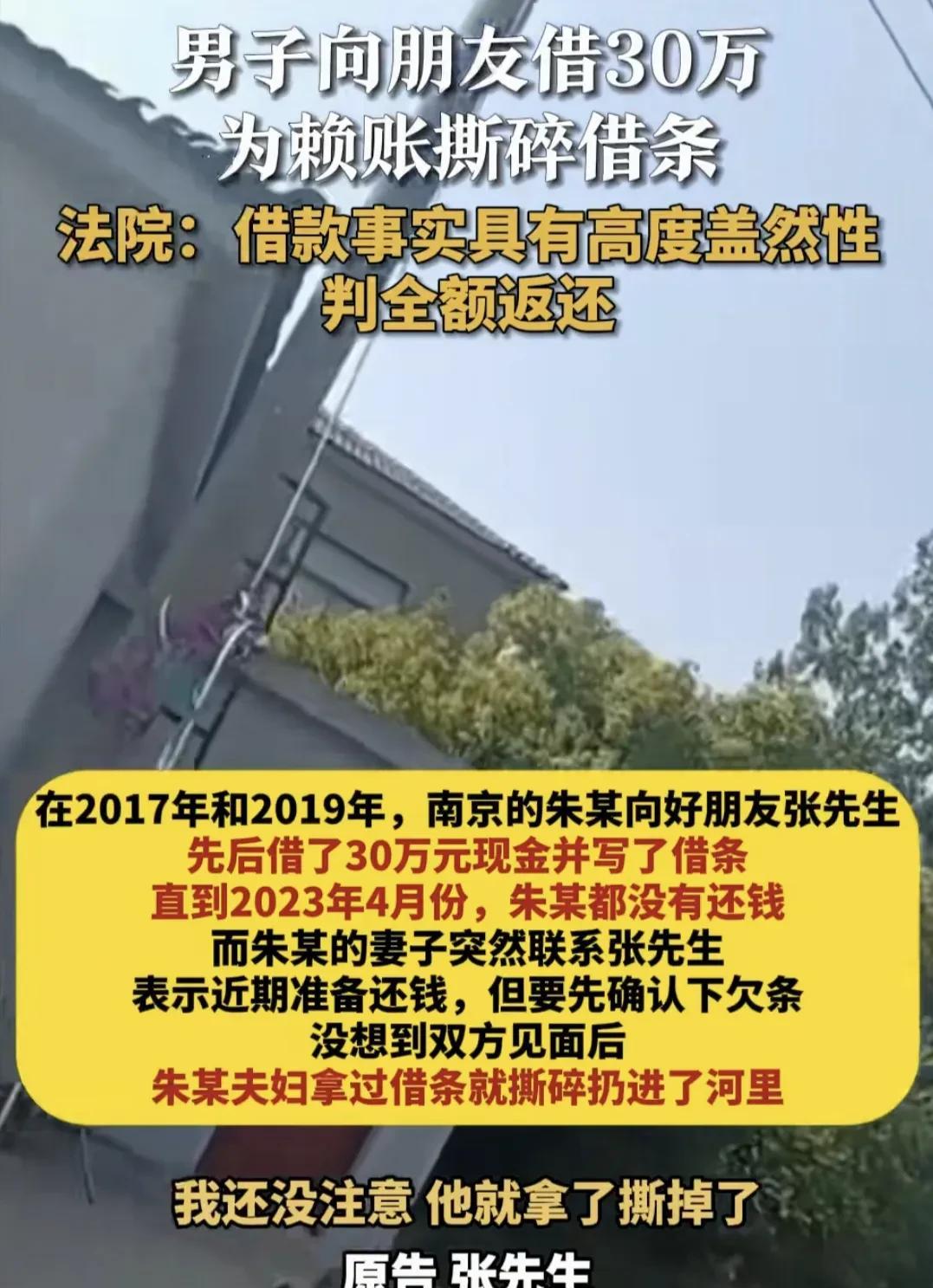 江苏南京,男子借给朋友30万,4年后,也就是2023年,朋友妻子突然找他,说看一眼借条好还钱,谁料,朋友夫妻拿到借条突然撕碎,扔进河里,男子一气之下告上法院,拿出一份证据,法院判决让人意外。网友:30万看清一家人,代价太大了。 张先生与朱某曾是多年好友。从2017年到2019年,因为这份情谊,张先生先后用现金借给朱某三十万元应急。朱某也按规矩写下了一张借条,这本是朋友间最基本的信用往来。张先生小心收好借条,也从未想过有一天需要靠它来对簿公堂。 可是,时间到了2023年,借款已过去四年多,朱某却对还钱的事只字不提。张先生多次催促无果,正一筹莫展时,朱某的妻子却突然主动联系他,说准备还钱了,但想先核对一下借条上的日期。 张先生一听,以为事情终于有了转机,便毫无防备地带着借条赴约。谁知,这根本不是还钱的诚意,而是一个精心布置的圈套。 见面刚一拿出借条,朱某夫妇竟一把抢过,以极快的速度将其撕得粉碎,顺手就扔进了旁边的河里。他们大概觉得,一撕一扔,三十万的债务就此灰飞烟灭,面对这种近乎无赖的行径,被彻底激怒的张先生没有选择私下纠缠,而是直接将朱某告上了法庭。 案子到了法院,难题也摆在了明面上:作为核心证据的借条没了,当初又是现金交付,没有银行转账记录。没了直接证据,这官司还怎么打。 不过,张先生虽然被朋友算计,却没有乱了阵脚。他向法庭提交了两样关键证据。第一,是大量他与朱某的微信聊天记录,里面有他反复催促还款的内容。这虽然不是直接证据,却能间接证明两人之间存在经济纠纷。 第二样证据,则更具杀伤力。或许是出于警惕,也或许是情急之下的本能,张先生竟然用手机录下了朱某夫妇抢夺并撕毁借条的全过程。这段视频,成了揭开对方“死无对证”企图的铁证。 面对这种看似证据不足的局面,法院启动了一项重要的证据认定原则“高度盖然性”。通俗点说,就是当没有直接证据时,法院会综合所有间接证据和常理进行推断,看哪一方的说法可能性更高,更符合逻辑。 如果朱某根本不欠钱,他为什么会给张先生写借条,又为什么要大费周章地抢夺并撕毁一张对他而言毫无意义的“废纸”,这种行为完全不符合常理,反而强烈暗示他想销毁一份对自己不利的证据。 张先生提供的微信催款记录,与朱某夫妇撕毁借条的视频形成了完整的证据链。一边是持续的催款,另一边是销毁凭证的极端行为,两者相互印证,让借款事实的轮廓愈发清晰。 朱某一方,在撕毁借条后,既拿不出自己已经还款的证据,也无法合理解释自己为何要撕掉那张纸。这种恶意毁灭证据的行为,在法律上会被推定为对原告主张的间接承认。 最终,法院采纳了“高度盖然性”原则,认定张先生主张的三十万借款事实成立,判决朱某必须全额归还。朱某不服上诉,二审法院也驳回上诉,维持了原判。 这个案子告诉我们,法律从不纵容投机取巧。试图通过毁灭证据来逃避责任,在逻辑上往往会留下更大的破绽。它也提醒我们,在金钱往来中,“防人之心不可无”从来不是一句空话。 保留书面凭证、优先选择银行转账、对关键证据进行拍照或复印备份,这些看似多余的举动,恰恰是在为自己构筑最坚固的保护墙。 朱某夫妻俩眠灭了良心,不是一家人不进一家门,真正的不如狼心狗肺,法院的判决,明察秋毫,公平公正,维护了受害人的利益,这对流氓夫妻真是人不要脸百事可为,这与抢劫有什么两样,幸好法院主持公道,不然真是告天天不应告地地不灵。