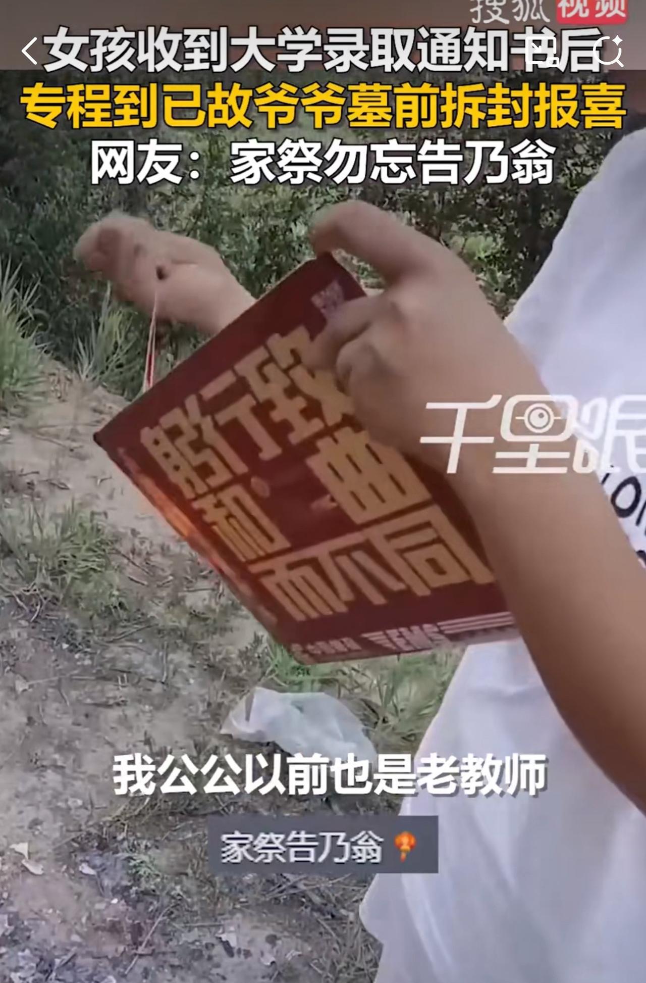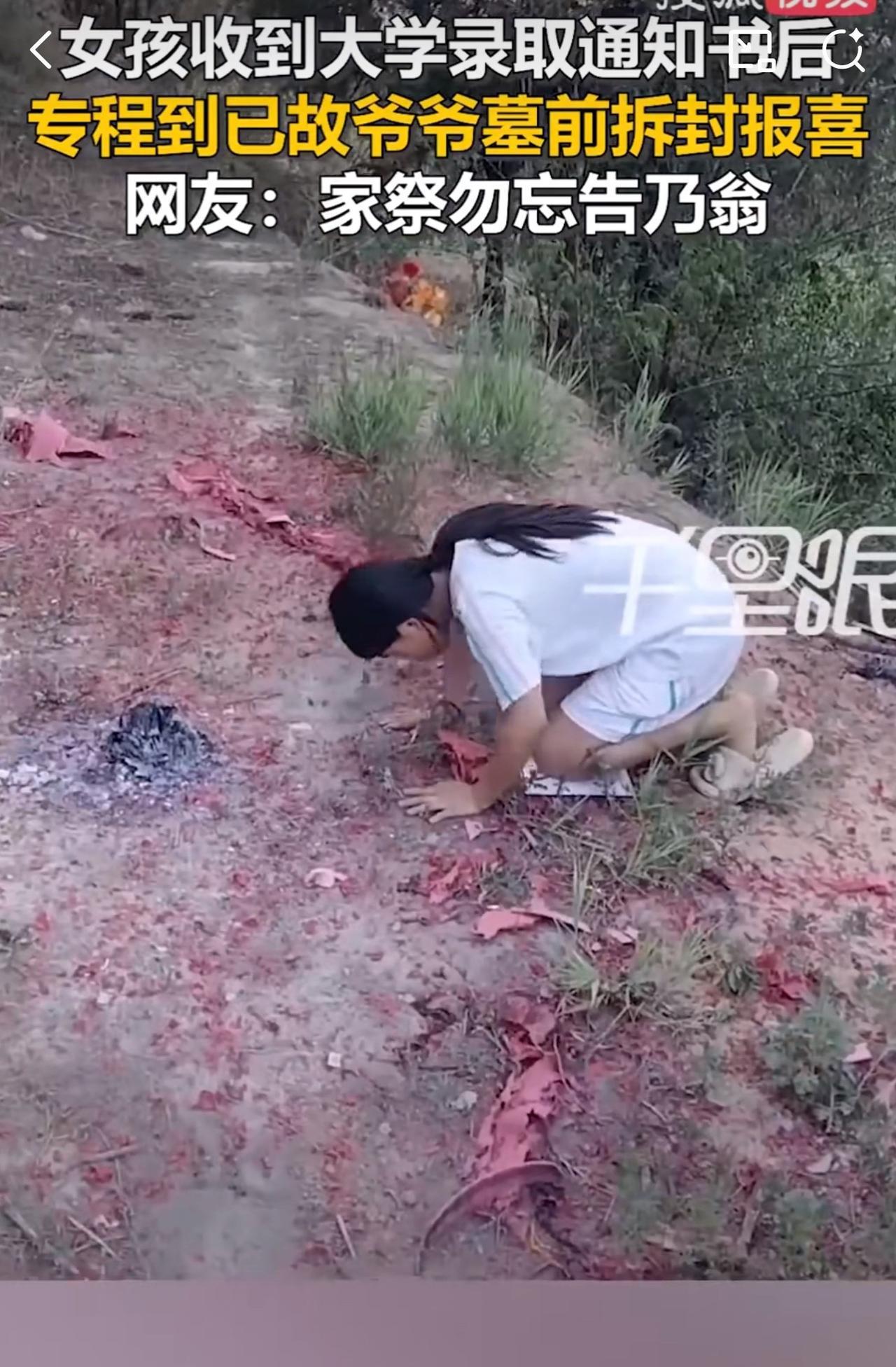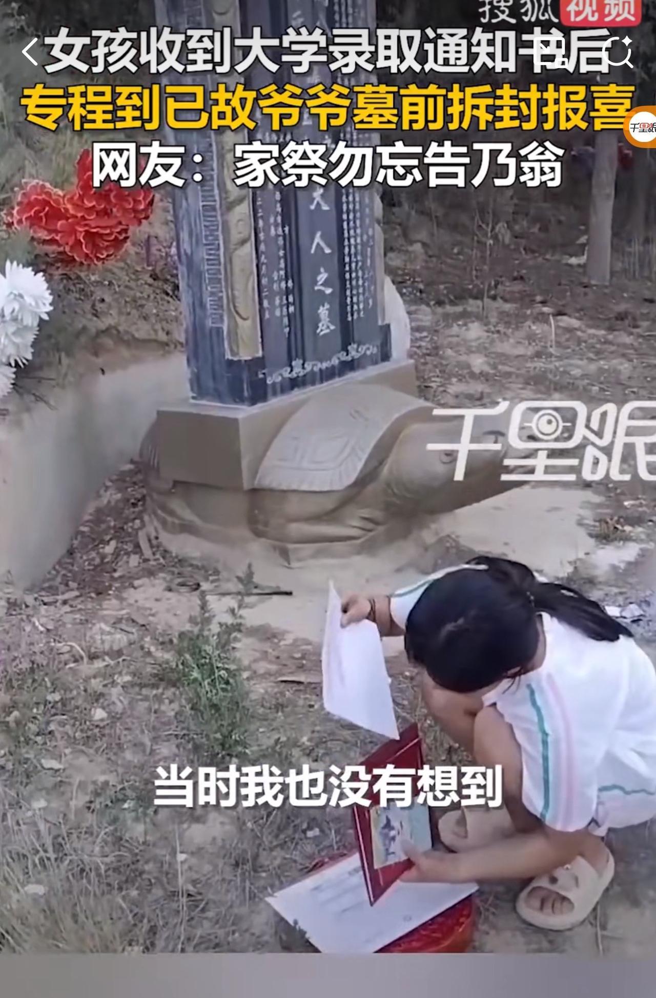 #MCN双量进阶计划#“泪奔!”陕西咸阳,一位女孩收到大学录取通知书时,不是和爸妈一起拆封,而是坚持要到已故的爷爷墓前拆封报喜,引发关注。 据这位女孩妈妈透露说:“公公生前是教师,2019年去世,一直非常疼爱孙女。当时收到录取通知书时,想让打来看一看,但女儿不肯,非要去她爷爷坟前拆,当时自己也没有想到,最后陪她一起去的。女儿成绩不算理想,但她已经尽力了,还是希望第一时间与爷爷分享喜悦!” 此视频曝光之后,不少网友感慨道,“这肯定与她爷爷感情特别深,家祭勿忘告乃翁!” 看这姑娘蹲在爷爷墓前拆通知书的样子,周少心里真有点酸酸的。老人走的时候可能还惦记着孙女能不能考上大学,现在孩子拿着通知书来“汇报”,这份心意比啥都重。 其实,咱们身边常有这样的事,老人在世时总盼着小辈有出息,哪怕是一句“我考上了”“我加薪了”,他们都能乐好几天。 可真等咱们做成了啥,有时候却没机会跟他们说了。这姑娘的做法,就像把心里那句没说出口的话,大声告诉了最想告诉的人。 有人说成绩不算顶尖,没啥的。但周少想说,在其家人心中,孩子高考已经尽力了,那就知足了,或许在其爷爷眼里,尽力的孙女就是最好的。就像咱小时候,哪怕考了个及格,真心为你高兴的长辈,眼里的光藏不住。 对于这位女孩到爷爷墓前拆大学录取通知书,大家怎么看呢?#长沙新朋友# #寻美三湘#