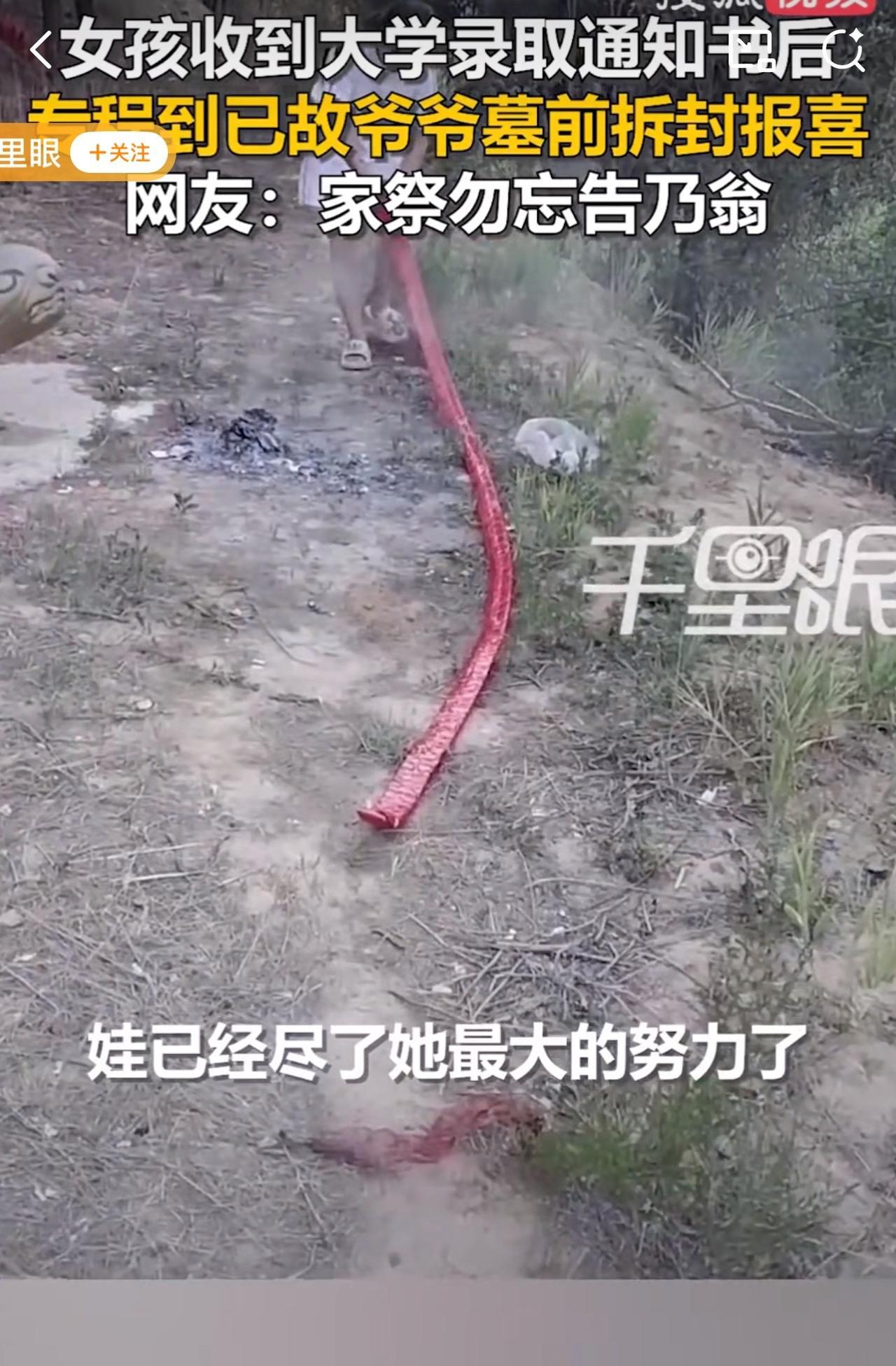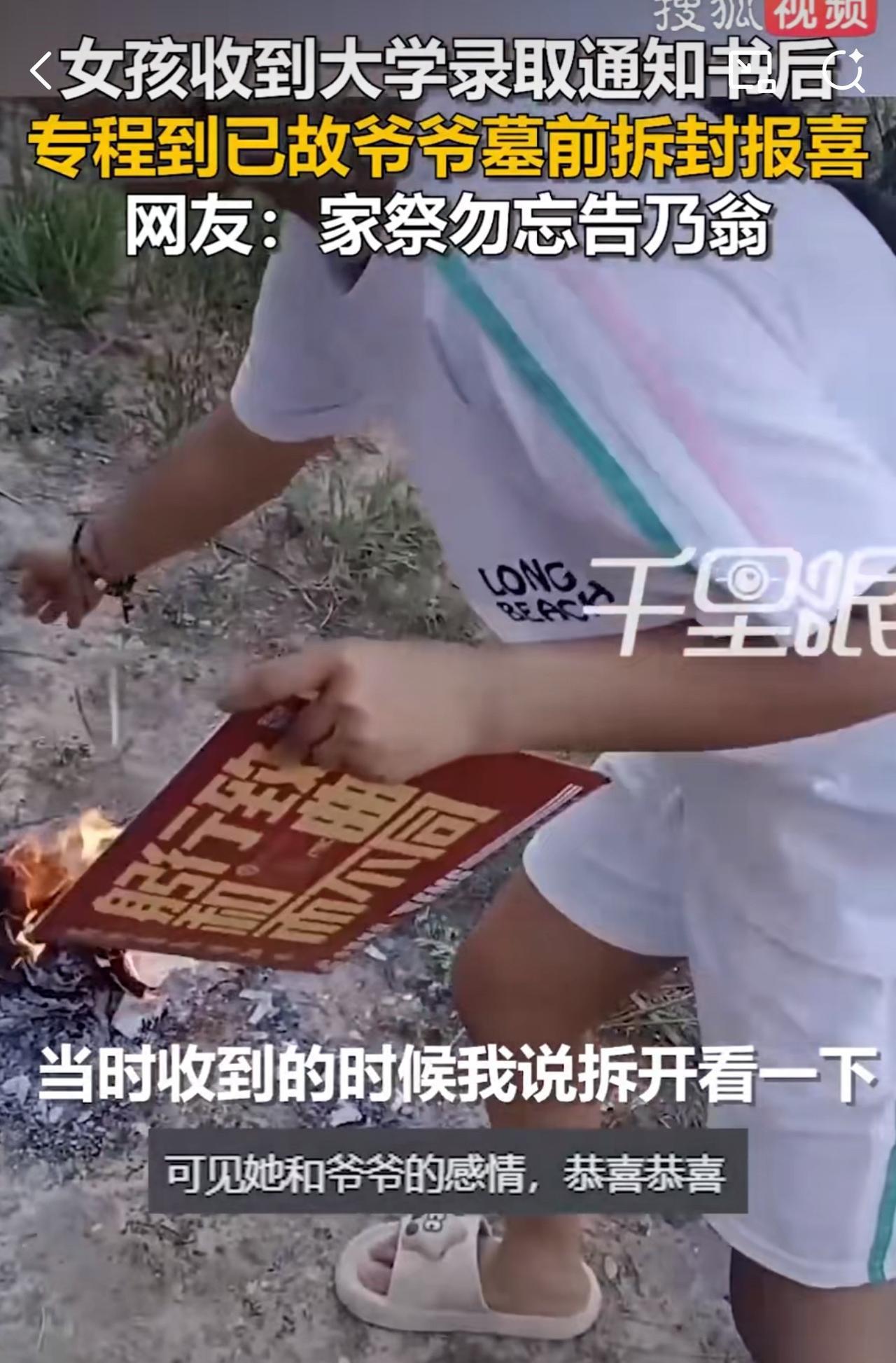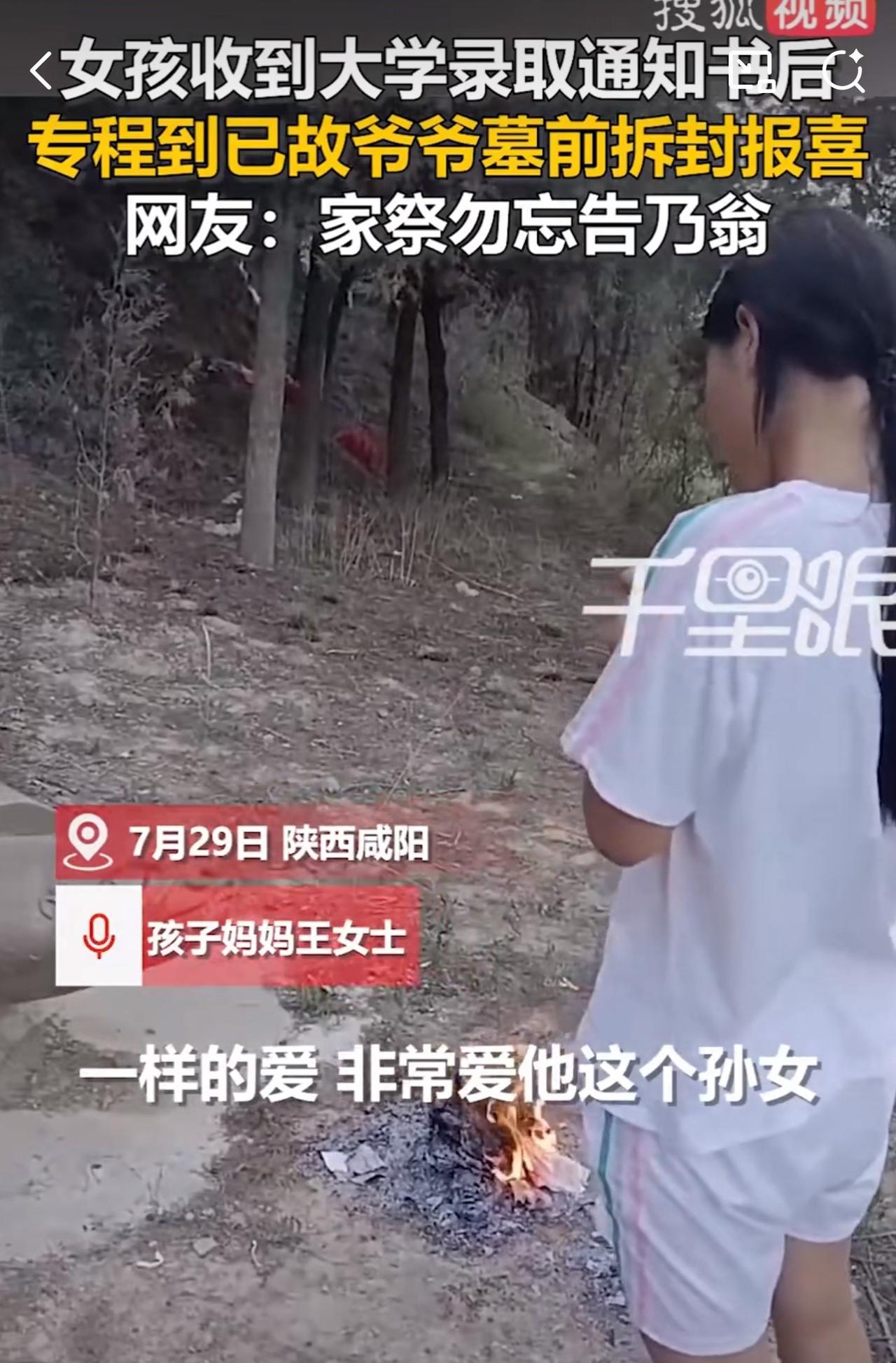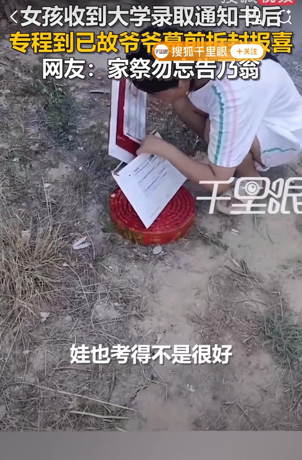 #MCN双量进阶计划#“泪奔!”陕西咸阳,一位女孩收到大学录取通知书时,不是和爸妈一起拆封,而是坚持要到已故的爷爷墓前拆封报喜,引发关注。 据这位女孩妈妈透露说:“公公生前是教师,2019年去世,一直非常疼爱孙女。当时收到录取通知书时,想让打来看一看,但女儿不肯,非要去她爷爷坟前拆,当时自己也没有想到,最后陪她一起去的。女儿成绩不算理想,但她已经尽力了,还是希望第一时间与爷爷分享喜悦!” 此视频曝光之后,不少网友感慨道,“这肯定与她爷爷感情特别深,家祭勿忘告乃翁!” 看这姑娘蹲在爷爷墓前拆通知书的样子,周少心里真有点酸酸的。老人走的时候可能还惦记着孙女能不能考上大学,现在孩子拿着通知书来“汇报”,这份心意比啥都重。 其实,咱们身边常有这样的事,老人在世时总盼着小辈有出息,哪怕是一句“我考上了”“我加薪了”,他们都能乐好几天。 可真等咱们做成了啥,有时候却没机会跟他们说了。这姑娘的做法,就像把心里那句没说出口的话,大声告诉了最想告诉的人。 有人说成绩不算顶尖,没啥的。但周少想说,在其家人心中,孩子高考已经尽力了,那就知足了,或许在其爷爷眼里,尽力的孙女就是最好的。就像咱小时候,哪怕考了个及格,真心为你高兴的长辈,眼里的光藏不住。 对于这位女孩到爷爷墓前拆大学录取通知书,大家怎么看呢?#长沙新朋友# #寻美三湘#