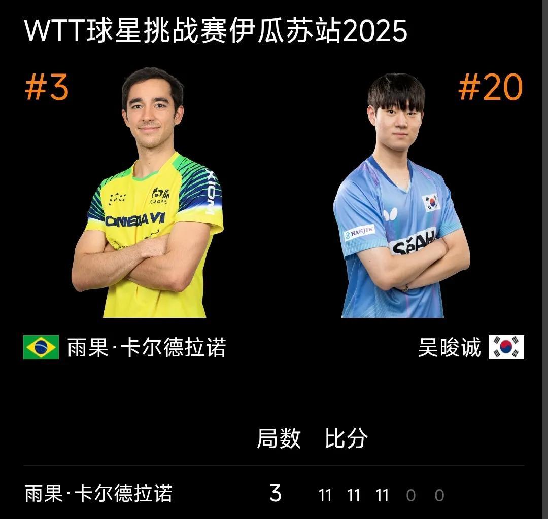 雨果3:0战胜吴晙诚晋级决赛! #WTT伊瓜苏球星挑战赛#男单半决赛,巴西雨果