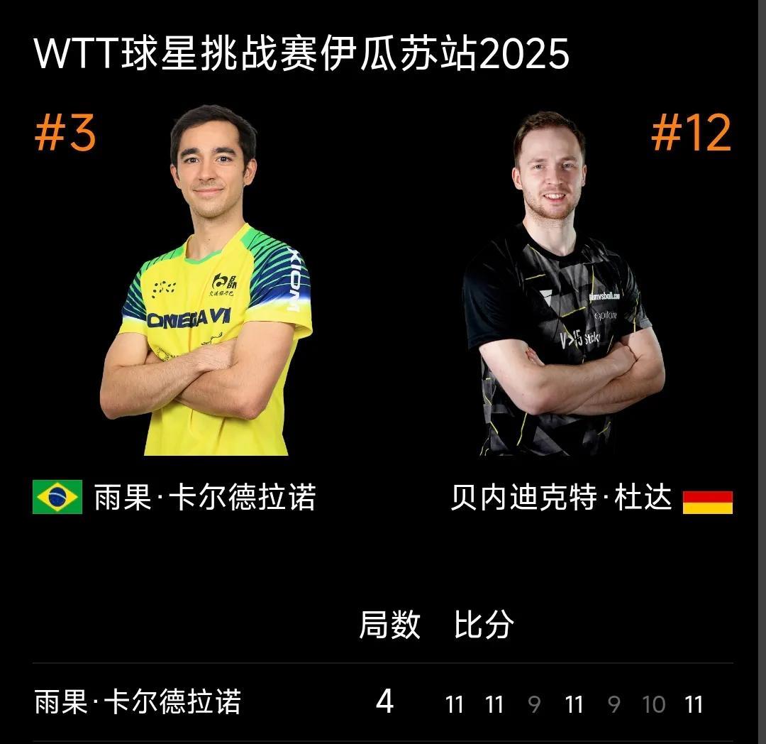 雨果4:3险胜杜达夺冠! #WTT伊瓜苏球星挑战赛#男单决赛,巴西雨果.卡尔德