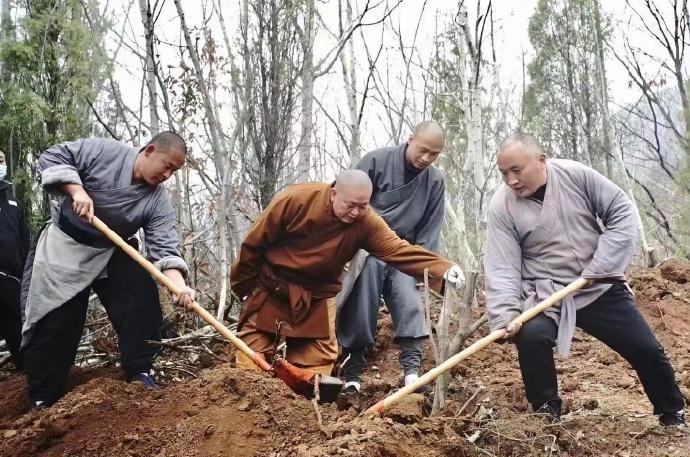 这是少林寺前方丈释永信带领少林弟子在山上挖土栽树。虽然,释永信的体型早已发福,但