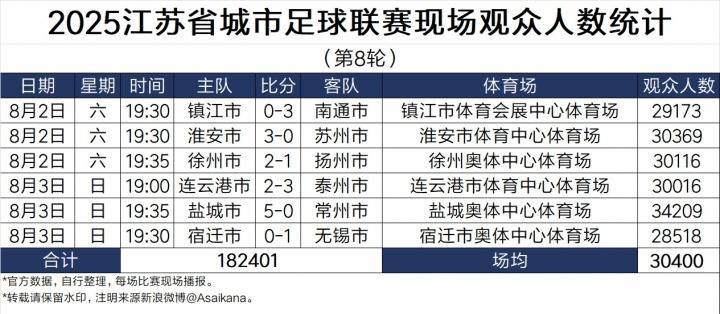 同一时间段中超上座人数和苏超上座人数对比,太直观了。 图一是中超第19轮上座人数统计,8场中超比赛现场观众总人数250463人,场均约31300人。上座最高的是大连梭鱼湾体育场,人数61039人,最少的是武汉三镇主场,人数9300人。 图二是苏超第8轮上座人数统计,6场苏超比赛现场观众人数总计182401,场均30400人。上座最高的是盐城奥体中心,人数34209人,最少的是宿迁奥体中心,人数21518人。 从场均观众人数来看,两者基本持平,中超超过3万观众的比赛依然是这4个火爆的主场,北京国安、大连英博、成都蓉城、深圳新鹏程,其他的基本不会过3万,武汉三镇主场甚至一万人以下。苏超几乎每场比赛人数都能达到3万,人数不能和收益画等号,毕竟苏超门票几乎是两位数以下,但是限制苏超观众的不是门票,而是体育场的容纳量。