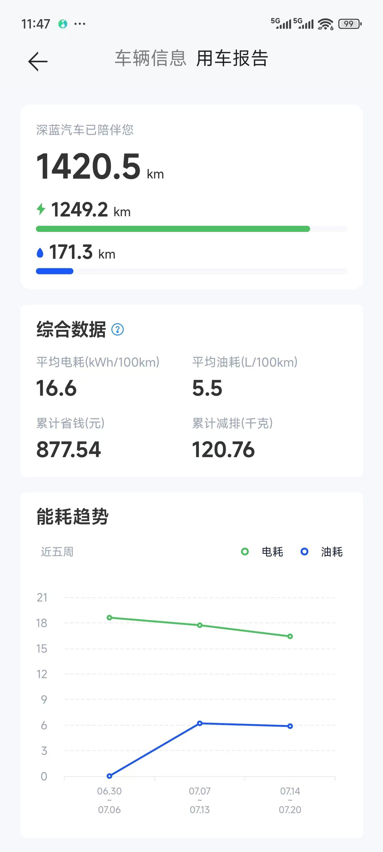 7月2号提车,到现在将近快一个月的时间,跑了1420公里,用电跑了1249.2公里,平均百公里的电耗在16.6,油跑了171.3公里,平均油耗在5.5升百公里,总体来说电耗和油耗都能够接受,毕竟外观大气,重量2吨的车来说已经很不错了,开在路上回头率很高,很多路人都没见过这种车,方盒子设计和前脸贯穿式灯带,提车后上完牌,就去售后把小黄灯和车标灯激活了,激活之后更加充满外来感的前脸机甲风。 空间:对于我工作需要,每天需要跑100多公里的续航,基本是实况纯电续航152公里刚好够一天使用,中午午休时间会把后排放倒,空间还是非常大的,毕竟车长有4920mm,后排放倒基本上就是纯平,中午午休还可以设置成小憩模式,比较人性化。 舒适性:买的四驱远山版,虽然没有顶配的空气悬挂配置,但是开在路上,过减速带或者坑坑洼洼的,在车上基本上没什么感觉,坐在车里也不会经过减速带,感受到很大的震动,而且这台车还有一个舒适刹车的功能,对晕车的人非常友好,在红绿灯或者下班高峰期需要停车的时候,在踩下刹车,前排和后排人员没有往前倾的现象,但是要看好与前车的刹车距离去刹车,开启这个功能制动距离会增加一点才能刹停,整车的馈电时候,增程器的介入,在车上也不会听到很大的声音,整车也是采用双层隔音玻璃,豪华车享受,试过我弟买的比亚迪的海豹06,比亚迪是插混,在馈电时候发动机介入,车上的噪音对比下来还是偏大 智能化:在高速上面用过领航智驾功能,有全适应巡航,还有定速巡航,再用这些功能的时候,需要扫描二维码观看视频才能使用这个功能,在对智驾不够清晰的还是要看清楚视频,会对自己认知多个了解,在高速上使用领航智驾,会感应到前车的距离,还有时速,如果前面的车速度过慢,智能驾驶会自动变道超车,对于长期需要跑高速或者马路的人增加了便捷性,在马路上跑感应到红绿灯会自动刹停,智能化方面还是够用,在马路上停车,打开车门时候,会感应到后方车辆做个警示,大大减少了马路上的安全隐患。 四驱:四驱可以不用,但是不能没有,有很多种模式可以使用,涉水模式,在现在台风天,经常路上就被淹的路况非常实用,会自动感应前面水深,然后在选择走不走,最大涉水深度也达到了600mm。还有雪地模式,沙地模式,等等,基本上对于现在能走的路况有很多选择,最重要这台车还带有坦克掉头,极大的增强了越野能力! 一直对方盒子外观设计的SUV比较喜欢,在深蓝G318没上市之前,看到坦克300的设计外观就很喜欢,但是看了综合油耗去到20升百公里劝退,后面出了谈何300Hi4-T,虽然增加了电池,但是纯电续航只有105公里,在对比深蓝G318的价位以及纯电续航,还是深蓝G318性价比高,纯电续航实际也能跑个158公里,追求硬派的造型又不想要油老虎,这台带电的深蓝G318真的可以放心冲