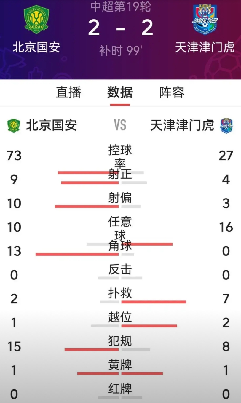 看到没,国安在本场比赛占据高达72%的控球率,貌似机会更多,但天津队绝对有机会赢球。国安实力无疑更强,但2:2的主场平局已拉低了夺冠概率。