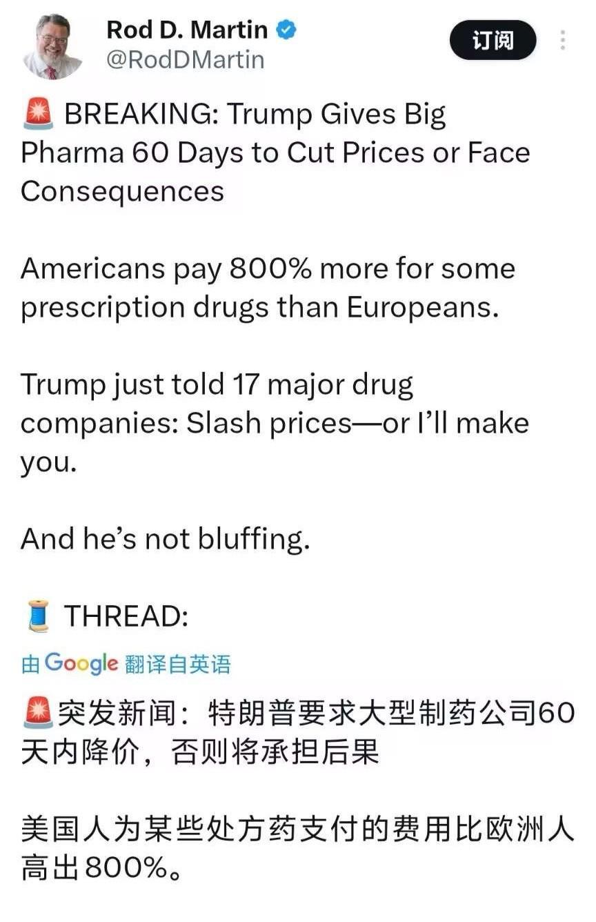 #头号创作者激励计划#特朗普表示,他下令美国药企将药价降低了1500% 特朗普接受采访表示,他要把美国药价压下来,3-4成过去人认为不错了,5-6成已经是极限了,而特朗普已经下令要求药企降价1500%,60天内药企必须完成降价,否则将惩罚药企和药企的管理阶层,美国17家药企均已收到政府告知信 特朗普特色资本主义,感觉应该是对照欧洲降低1500%,然后就是未来药价变为现在的6%,实际药价降低了94%。 对于美国药企来说,这比集采还狠,按脚指头截肢的,别说利润了,保本估计都费劲