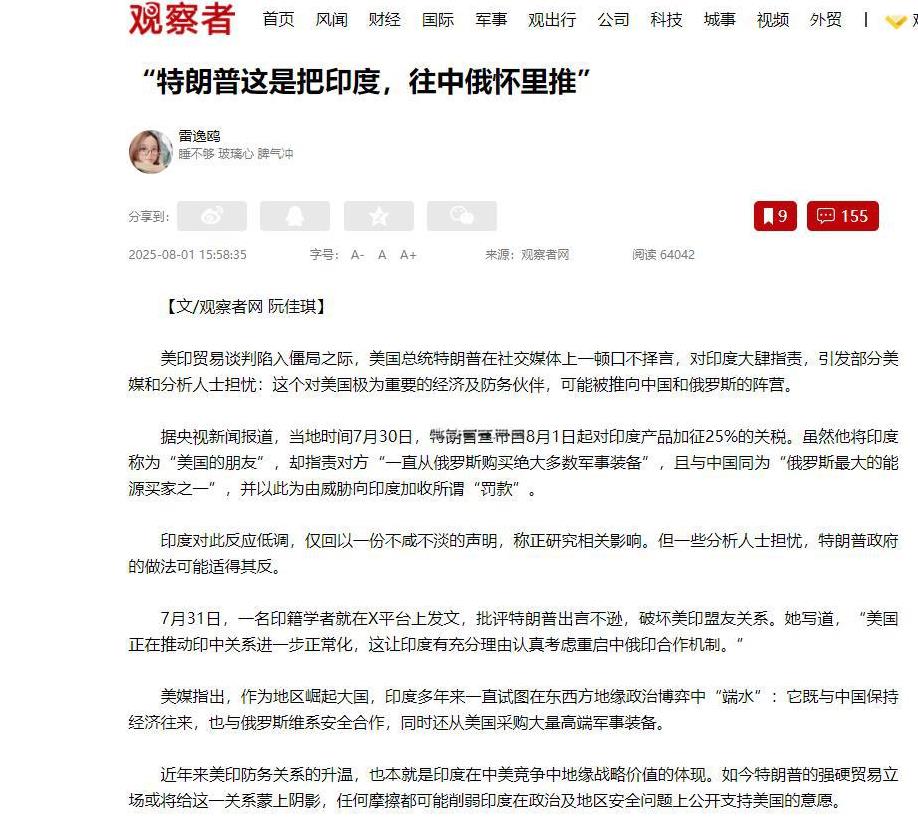 特朗普这葫芦里到底卖的什么药?一边口口声声把印度称作“朋友”,一边却毫不留情地抡起关税大棒,狠狠地砸向印度。不仅如此,还对印度购买俄罗斯的东西横加指责,这般行径,实在令人费解。要知道,印度可是个擅长左右逢源的大国,特朗普难道就丝毫不担心,自己的这些举动会把印度彻底推向中国和俄罗斯这边吗? 众所周知,印度是最吃不得硬,向来把自己的 “说了算” 当命根子。 特朗普这套又打又骂的操作,与其说是谈判,不如说是在逼印度选边站。 大伙儿都在看印度咋选:是接着跟美国混,还是跟中俄搭伙? 特朗普这么一闹,多半是帮了中俄。对印度来说,自己能说了算比啥都重要。 这选择早有苗头,特朗普不过是捅破了窗户纸。 特朗普一门心思顾美国,反倒让印度改了主意。印度最烦被人逼,现在被美国这么折腾,往中俄那边靠靠也正常。 印度有了别的想法,中俄态度如何呢? 中俄最近都在给印度递好。俄罗斯老说要重启三方合作,中国也说合作对地区好。 从现实情况来看,这事儿有戏。特朗普加关税得罪了中印,反倒给三方合作搭了桥。 其实印度之前在大国间周旋得挺好,是特朗普没给它机会。 印度这些年左右逢源,可特朗普抡起关税大棒,打破了平衡。 美国要动印度农民的根本,印度只能说:不行就换地方。 最近中印互动多了,就是在告诉美国:我有别的路。 特朗普到底做了啥,让印度这么大反应? 7 月 30 号,特朗普突然要对印度商品加 25% 关税,还数落它买俄罗斯的东西,要增加 “罚款”。 这下把美印关系搞僵了,连美国媒体都急了,说这是把印度往对手那推。 印度官方没咋说,但学界民间炸了锅,说美国这是逼印度跟中俄合作。 中俄印真合作起来,影响可不小。这三国都是金砖和上合成员,真合作就能形成跟西方叫特朗普搞板的力量。 保护主义,反倒让印度明白:鸡蛋不能放一个篮子里。