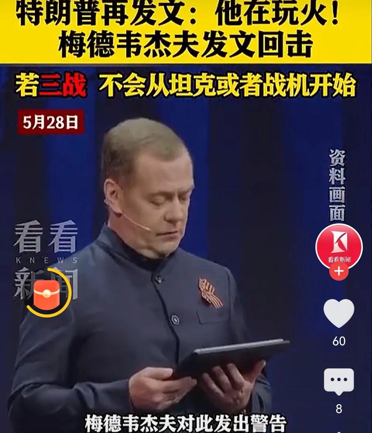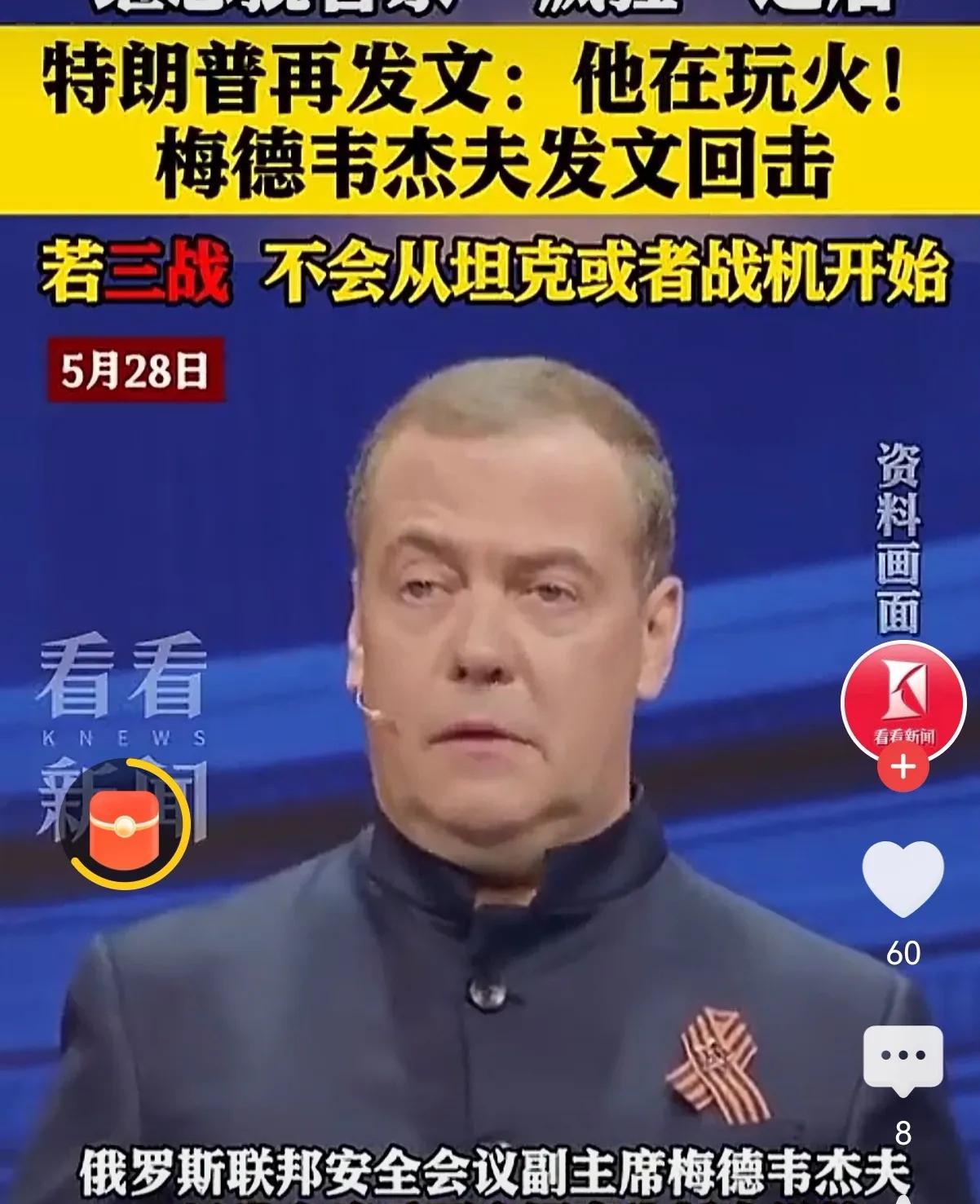 特朗普与梅德韦杰夫隔空对战,梅德韦杰夫警告特朗普:“如果继续援乌,三次世界大战将不会是坦克和飞机开始……”,特朗普回应梅德韦杰夫:“关于梅德韦杰夫看看这个该死的矮子,喝了几杯伏特加就突然觉得自己是世界领袖,太有趣了,他认为他应该座在大桌子上,没门,这个形象不适合你,满脸醉态才适合你,所以给我们大家一个面子,乖乖地坐下,让大人去处理正经事吧!”