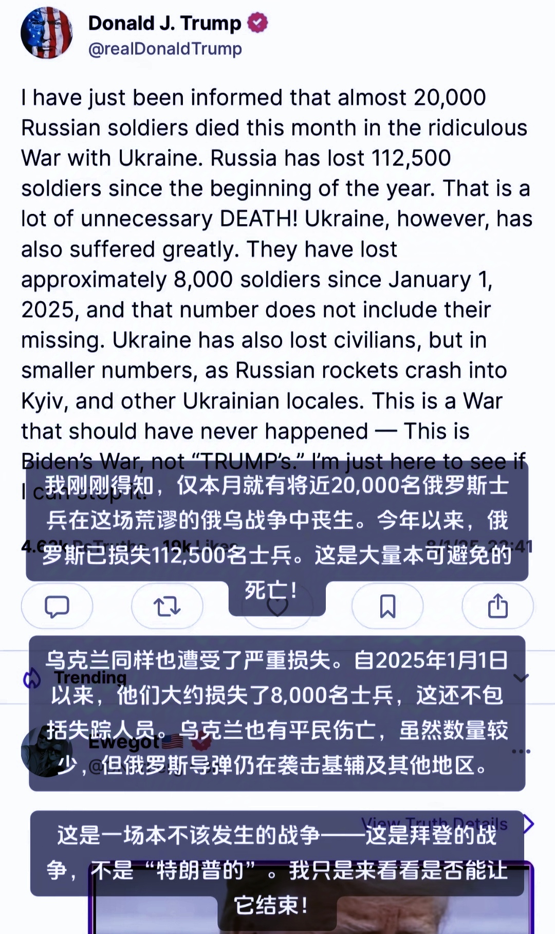 现在最着急的是以美国为首的北约国家,毕竟打了这么久,提供了那么多武器,提供了那么多资金,还打着雇佣兵的幌子亲自下场,俄罗斯几千亿欧元也被冻结了,企业也全部撤离俄罗斯,但就是打不赢俄军,扎心的是一大堆北约高级军官葬送战场。三年半过去,现在美国终于祭出最后的大招,也就是二级关税,老美已经放话,8月8号,如果双方还没有达成和平协议,那么就会对购买俄罗斯石油的国家征收100%关税,说简单点就是让俄罗斯一滴石油也卖不出去,能源卖不出去,意味着俄罗斯将失去巨额收入,说白了老美就是让俄罗斯没钱支撑战争。那么大家觉得美国此举能逼迫俄罗斯收手吗!