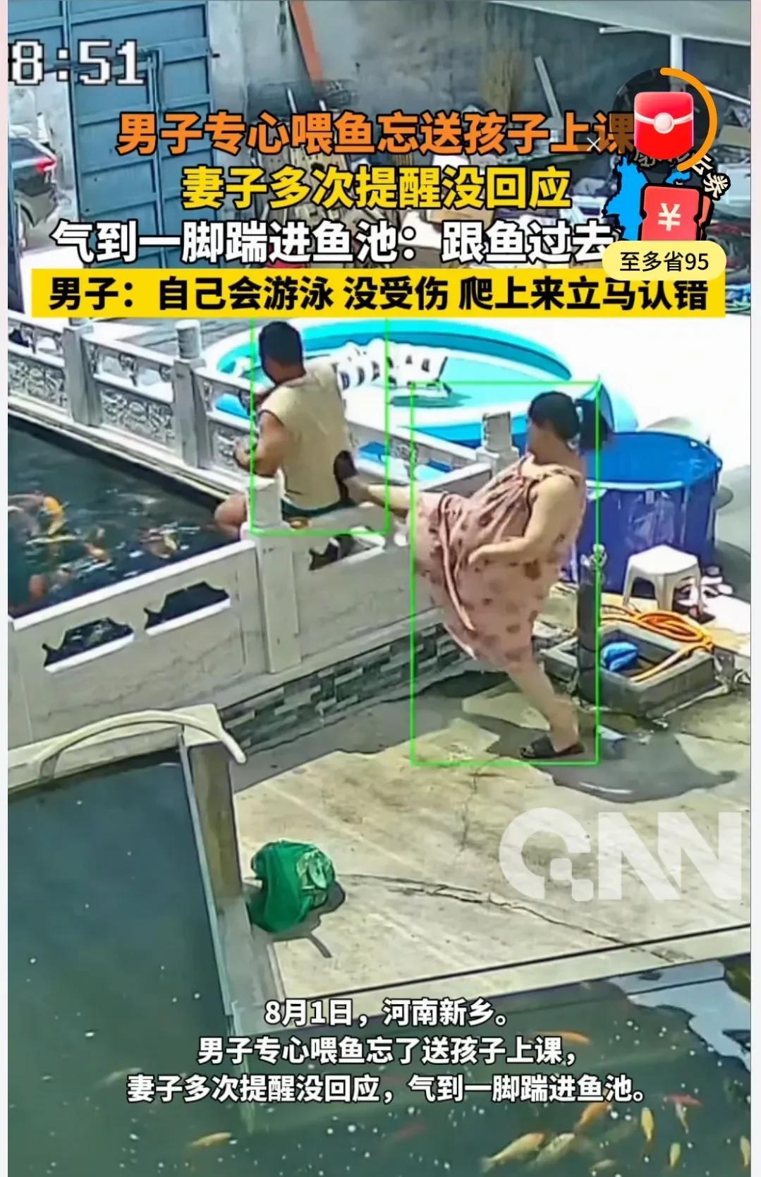 沉浸式爱好,真能把世界忘了,一个人要是能把工作如此专注,什么事不能有成就呢?但也要看你的沉浸式爱好用在什么地方。 最近,河南新乡一男子因为沉浸式爱好喂鱼,被老婆一脚踹进了鱼塘。因为他专心喂鱼,忘记了正事:送孩子上课。结果妻子气得一脚把他大老爷们踹进了鱼池。吼道:跟鱼去过吧!(星视频)
