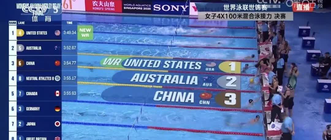 从零开始再出发!世锦赛落幕,中国游泳队捞铜收场 8月3日晚,世锦赛游泳项目最后一场比赛。 中国队游出3分56秒70,以预赛第四名的身份,进入女子4X100米混合泳接力决赛。 中国队4棒分别为彭旭玮、唐钱婷、张雨霏、程玉洁,6道出发。 最终,中国队游出3分54秒77,名列第三。 本届世锦赛落幕。喜怒哀乐,酸甜苦辣,已成为过去。从零开始,再出发。