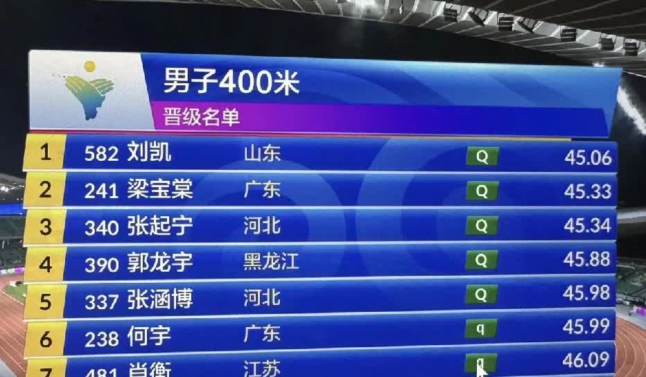 厉害,厉害!!!!! 400米全国纪录今日改写。 郭钟泽保持八年之久的全国纪录被打破。新的400米全国纪录——刘凯跑出45.06晋级。同时梁宝棠45秒33刷新PB,张起宁45秒34刷新PB。今年很有希望打破45秒大关,期待明天的巅峰对决。