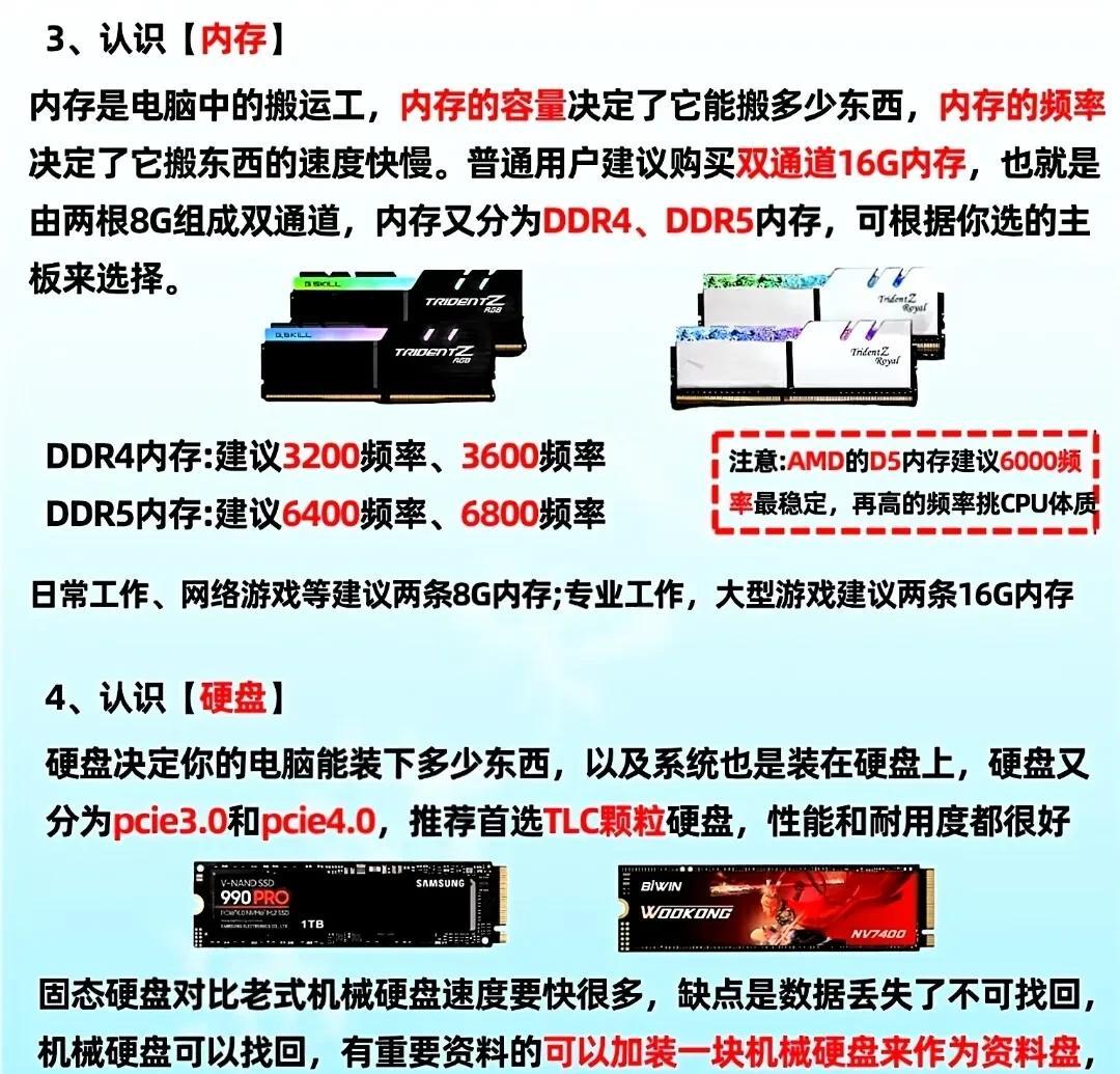 组装电脑DIY电脑指南,手把手教你避坑。 小伙伴们,今天来给大家分享一下如何自己DIY组装电脑,既能体验动手的乐趣,又能省下一笔冤枉钱哦! 【组装电脑八大件】 CPU:电脑核心,品牌Intel和AMD,按需选择。 主板:根据CPU型号选择兼容的主板,Intel主板分为H系列(入门)、B系列(主流)、Z系列(高端);AMD主板分为A系列(入门)、B系列(主流)、X系列(高端)。 内存:电脑的搬运工,普通用户建议双通道16G内存,DDR4或DDR5根据主板选择,频率也有不同建议哦。 硬盘:决定电脑存储容量,建议TLC颗粒硬盘,pcie3.0和pcie4.0可选,固态硬盘速度快,机械硬盘可作资料盘。 显卡:根据用途选择,预算越高性能越强,推御三家。 电源:根据CPU和显卡功耗选择合适瓦数,不要省这点钱,否则可能烧主板哦!电源有不同认证和尺寸,要注意兼容性。 散热:根据CPU选择风冷或水冷,不同铜管数量散热效果不同。 机箱:注意支持的主板尺寸、散热尺寸和显卡尺寸,大机箱散热好,小机箱方便携带。 【注意事项】 在挑选硬件时,一定要注意兼容性,避免出现硬件不匹配的情况。 #头号创作者激励计划#