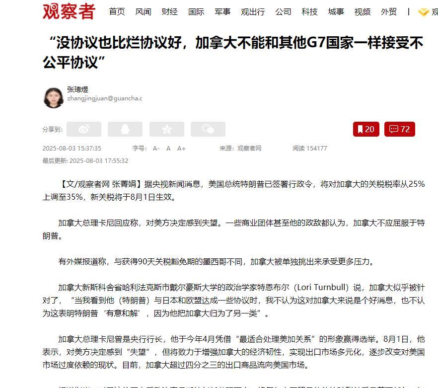 加拿大就是硬气!宁可没协议,也不签那坑人的烂协议,绝不当G7里的冤大头!特朗普把关税提到35%又怎样?加拿大人心里门儿清,那些盟友签的协议满是坑,自己可不上当。你看,负责谈判的勒布朗早放话了,只接划算的,吃亏的免谈。这股子拧劲儿,硬是要和美国较个真儿。 加拿大负责谈事的勒布朗还在跟美国商务部的人联系,想八月份坐下来聊聊。 但他把话挑明了:只接对加拿大划算的协议,吃亏的事绝对不干。 加拿大人早就把特朗普那点心思摸透了。他跟欧盟、日本签的那些协议,谁看了都知道不公平,欧盟被逼着多交 15% 的税,还得买美国的能源和武器,被骂成 “投降协议”。 加拿大可不想走这条路,商会的人说得实在:赶紧签个烂协议,还不如不签呢。 加拿大人不只是嘴上说说,真的动手了。大家开始不买美国货,美国的酒从店里下架了,去美国玩的旅行团也取消了。 那些靠加拿大游客赚钱的美国边境城市,日子不好过了。听说特朗普知道后气坏了,这招虽然不算厉害,倒真让美国吃了点亏。 加拿大央行有数据在那儿撑着,心里有谱。第二季度经济增长是慢了点,但实际上要交的税也就 5%,比好多国家都低,说明经济没看上去那么不经折腾。 卡尼政府正想办法,让出口的路多点,把眼光放到亚洲和欧洲,别总盯着美国。 小企业这段时间确实难。以前觉得税低,懒得去办那个啥认证,现在没办法只能硬着头皮弄,成本高了,赚的钱少了。 有老板说,35% 的税一收,每笔生意都在赔钱。但加拿大商会觉得,现在麻烦点没事,不能签让后代吃亏的协议。 加拿大也不是没本钱。美墨加那个协定里,95% 的出口东西都合格,不用多交税。 安大略省占加拿大经济的 40%,是工业中心,省长福特说要对美国的钢铁和铝多收 50% 的税来回击。 加拿大有石油、矿石、电这些好东西,美国离不了,没必要怕。 特朗普做事没个准,前一天还威胁说加拿大承认巴勒斯坦国会影响贸易谈判,第二天就改口说 “也许能谈”,这种一天一个样的德性,加拿大人早习惯了。 美国说加税是因为加拿大没管好芬太尼往美国流,可实际数据在那儿,美国查到的芬太尼,从加拿大北边过来的还不到 0.2%。 加拿大去年花了 9 亿加元加强边境管理,还专门找人负责芬太尼的事。用这个当理由加税,实在说不过去。 8 月 1 日美国把对加拿大的税从 25% 涨到 35%,在加拿大闹得挺大。 但加拿大人没慌,反而更坚决了,特朗普把税提得再高,理由编得再花哨,加拿大人心里都有杆秤——不公平的协议,签了就是坑自己、坑后人。 你看那些盟友签的协议,明摆着吃大亏,加拿大可不想步后尘。 手里有能让美国惦记的宝贝,老百姓也拧成一股绳,大不了慢慢熬,总能找到出路。反正一句话:烂协议?想都别想!