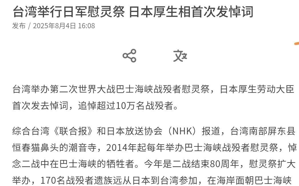 我们纪念抗战胜利八十周年,没想到民进党当局竟然举办第二次世界大战巴士海峡战殁者慰灵祭!8月4日,根据联合早报报道,联合早报称,台湾南部屏东县恒春猫鼻头的潮音寺,2014年起每年举办巴士海峡战殁者慰灵祭,悼念二战中在巴士海峡的牺牲者。今年是二战结束80周年,慰灵祭扩大举办,日本厚生劳动大臣,乃至战犯亲属均出席祭拜。 台湾日本关系协会长苏嘉全声称,战争期间超过10万人在巴士海峡“不幸罹难”,要共同追思历史、缅怀亡者,珍惜得来不易的和平;台湾作为热爱和平“国家”,将持续与日本以及其他理念相同的国家携手合作,推动区域乃至全球和平与繁荣。我们抗日战争胜利80周年,没想到民进党当局竟然举办巴士海峡战殁者慰灵祭。 为什么民进党当局搞这样的动作,说白了民进党当局这就是通过灵祭献媚于日本,帮助日本美化侵略行径,以换取日本支持其“台独”主张。日本二战期间超过十万人死于巴士海峡,这些人不是“不幸罹难”,而是咎由自取,不值得丝毫的同情。如果战争贩子应该祭拜,那请问我们将以什么去祭拜抵抗侵略的人呢? 很显然,民进党当局毫无民族大义,为了其“台独”主张,数典忘祖,不惜与侵略者为伍,让人不耻。如果要真正的实现持久的和平,其一,日本应该为其战争罪行公开认错。其二,日本应该正视历史事实,拒绝任何对侵略者的美化。其三,各国也应该铭记侵略的历史。无疑,民进党的所作所为,这完全是出于政治私利的无耻行径,令人唾弃。 #头号创作者激励计划#