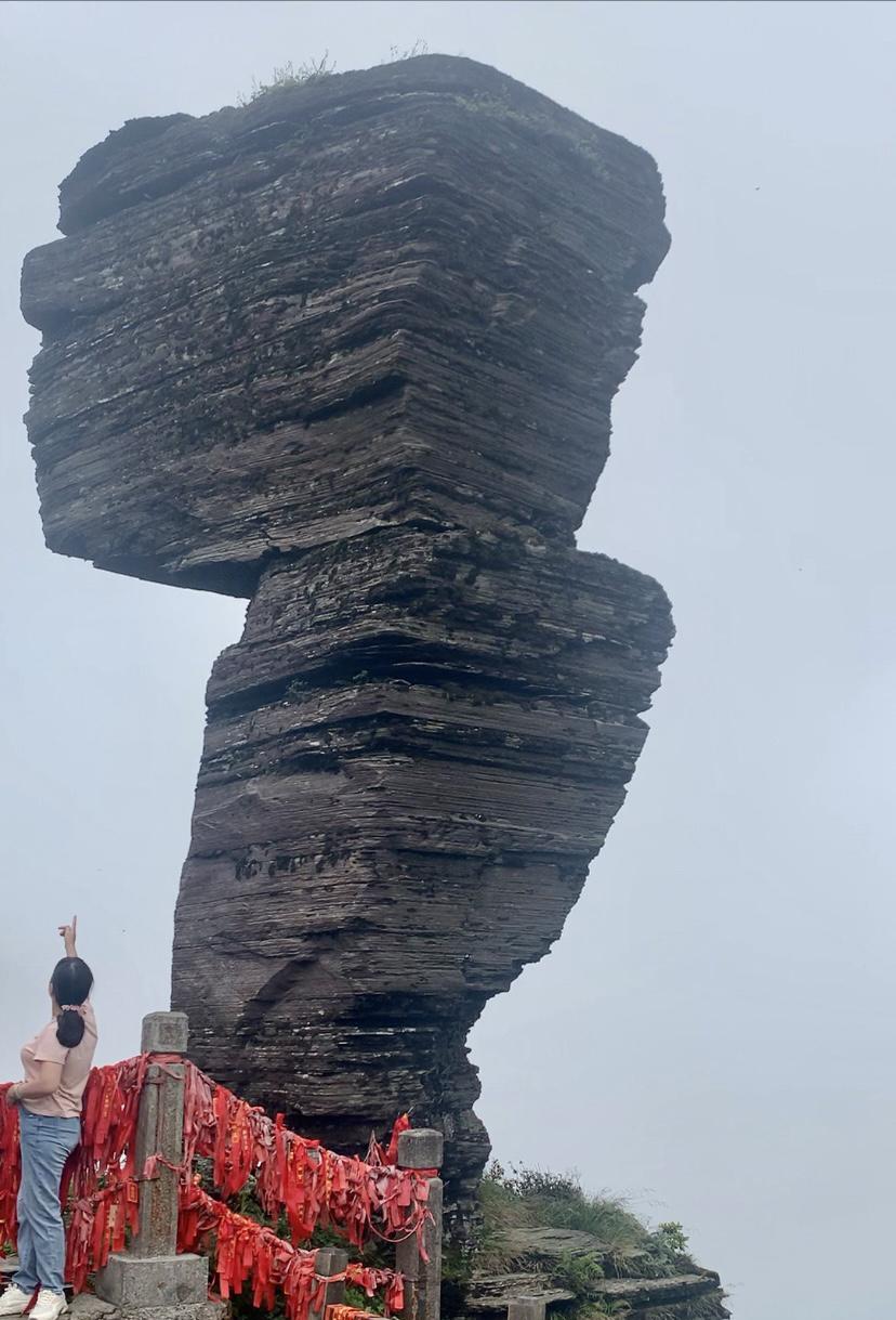 贵州旅游第五天,梵净山。 整体感受:一个字,累。两个字,真累。三个字,太累了!这还是坐索道上下的,不然……不敢想象! 旅游心得:只在此山中,云深不知处。山上云雾缭绕,这山不见那山。 早上6:30从镇远古城出发,路程2小时到达梵净山景区侯检区。梵净山进入景区是需要提前预约时间段的。我们这个团的导游约的是十点的。8:30开始排队,队伍缓缓前行,等到我们到检票口刚好十点,可以想象人有多少。排队等问题不大,关键是天太热了,气温能有三十二三度,湿热天气让人实在是受不了。 进入景区先排队坐10分钟摆渡车。摆渡车在狭窄婉转的山路间飞速前行,司机师傅既要看着山路还要躲避对面过来的摆渡车,真是很厉害。 跟我一个车厢的,不知道哪来的游客,十五分钟的缆车行程,破嘴一停不停的说,说缆车要是掉下去了他买的保险就有用了。整个一个神经病! 下了缆车,开始爬山的艰苦之旅。炎热的天气下爬不了几步就汗流满面,只能是走走停停,歇歇再爬。 好不容易到达第一个景点:蘑菇石。已经是累的腰酸腿疼,浑身发软。 休息了好久,才站起来继续前行。从这里一是往红云金顶方面,一是往老金顶方向。来梵净山的游客基本是奔着红云金顶景点。但去这里必须预约才能去。我11:27开始预约,预约号是4509。当时才叫号叫到1919号。问了一下导游,导游说至少等两三个小时。 算了,不等了,去不用预约的老金顶吧。结果走了一半,媳妇膝盖疼。到老金顶还有一百多米近乎垂直、只有四五十厘米的山路要爬。算了,不上去了。 人生不能十全十美,爬山也不能到顶。只能这么安慰自己吧。 返程中,路过一座明代寺庙“承恩寺”,进去请了三柱高香,保佑全家平安健康,幸福快乐。寺里和尚正在施粥,排队乘了一碗,香甜可口,心中虔诚感恩! 山不见我,我便不见山。 我遇见佛,必拜佛,因为佛在心中。 坐索道下山,转摆渡车出山门。15:16。手机信息提醒,看了一眼:你预约“红云金顶”到号了。[捂脸][捂脸][捂脸]