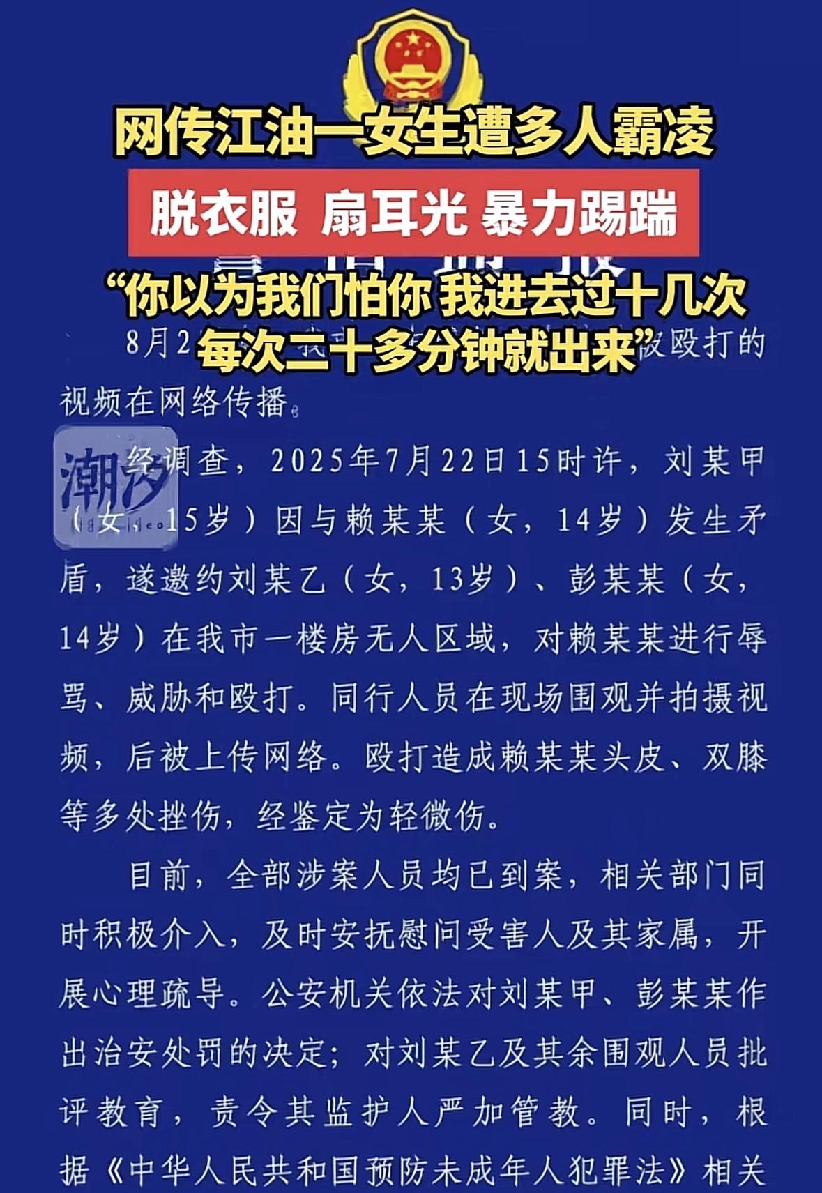 四川江油,女孩妈妈是聋哑人,同学们知道后,经常明里暗里欺负她,这天,女孩被3个女同学叫到一处没人的楼房里,一见面,3人就举着手机,让女孩把衣服 脱了,女孩不肯照做,就被女同学们抓着头发,扇她耳光,一顿拳打脚踢,女孩哭着说我爸爸会报警的,谁知为首女同学竟不屑地说:我都已经进去过十几次了,每次不到20分钟就出来了,我怕你? 8月4号,据蓝睛报道,小赖的妈妈是聋哑人,这件事在同学间传开后,小赖在学校里特别不受待见,成了被欺负的对象。 同学明里暗里说她是"哑巴的女儿",小赖听了心里很不是滋味。 除了忍受口语上的攻击,小赖也没少挨别的欺负。 课间休息时,她经常被同班女生堵在厕所里,甚至生活费也会被女同学抢走拿去做美甲。 她不是没试过向老师求助,可每次老师批评后,霸 凌就会变本加厉。 小赖因为这些精神和心理上都不是很好,她几次想转学,都没转成功,只能接着默默忍受。 7月22日下午,有3个女同学给她发来消息,说出来见一面,有话对你说。 小赖知道她们没安好心,压根不敢赴约,结果为首姓刘的女同学说,你要是敢不出来,信不信我们去你家打你? 小赖听到这句威胁,当时就怕了,只好出了门。 见面后,3个女同学把小赖强行带到一个废弃的烂尾楼里。 带头的女生刘某甲掏出手机,镜头对准小赖,让她把衣服全脱了。 小赖死死抓着衣领摇头,3人见她不肯服从,开始轮流对她拳打脚踢。 响亮的耳光声在空楼里回荡,有人用脚踹她的膝盖,有人揪着她的头发往地上撞,另一人则拿着手机全程录像。 小赖不敢反抗,她深知自己势单力薄,不是3人的对手,只好蜷缩着身子挨打,每被打一下,都疼得叫出声来。 被打得受不了了,小赖就带着哭腔警告道,你们要是再打我,我就告诉我爸爸,他会报警的! 这时,带头的女生刘某甲不屑地说:你威胁我们?又不是没进去过,以为我们怕吗?我都已经进过派出所十多次了!没过20分钟就出来了,就算你爸报警又能把我怎样? 后来,这句话随着视频在网络疯传,小赖的母亲看到女儿被打的视频,心疼又气愤,几度晕厥过去。 警方通报显示,这场持续20分钟的暴行造成小赖头皮血肿、双膝大面积淤青,经鉴定为轻微伤。 3个施暴者中,刘某甲15岁已有13次治安记录,彭某某14岁参与过3次校园霸 凌。 有人认为,最主要的原因就是施暴几乎没有成本,对于这类人,批评教育是远远不够的,霸 凌者必须重罚。 身体上轻伤,但精神上伤又如何衡量呢?校园霸 凌是一个极其恶劣的问题,它会让当事人一辈子留下阴影,也对孩子教育产生不良影响。 这种霸凌到底何时才能制止?每次看到都感觉特别的难受,必须用法条来约束,不能因年龄而逃脱责任,这样只会让他们更加有恃无恐。 那么,从法律角度来看,3名女同学将会面临怎样的惩罚? 《预防未成年人犯罪法》第44条规定:未成年人有下列严重不良行为的,公安机关可以及时制止,对其进行批评教育,并可以责令其父母或者其他监护人、学校严加管教;必要时,依法进行专门矫治教育:殴打、辱骂、恐吓,或者故意伤害他人身体;纠集他人结伙滋事,扰乱治安。 刘某甲组织另外2人对小赖实施辱骂、威胁、殴打,并拍摄传播暴力视频,符合“殴打、辱骂他人”“结伙滋事”的严重不良行为。 刘某甲自称“进过派出所十多次”,显示其长期存在违法倾向,普通管教措施已失效。 暴力行为导致小赖轻微伤且视频广泛传播,造成恶劣社会影响,需通过专门教育阻断其犯罪路径。 警方通报,根据《预防未成年人犯罪法》,这两名少女将被送入专门学校接受矫治教育。 而13岁的刘某乙因未达刑事责任年龄,只能由监护人带回严加管教。 公安依据本条将刘某甲、彭某某送入专门学校,既体现了对未成年人“保护优先”的原则,也明确了“教育、感化、挽救”的方针。 《民法典》第1188条规定:无民事行为能力人、限制民事行为能力人造成他人损害的,由监护人承担侵权责任。监护人尽到监护职责的,可以减轻其侵权责任。有财产的无民事行为能力人、限制民事行为能力人造成他人损害的,从本人财产中支付赔偿费用;不足部分,由监护人赔偿。 刘某甲(15岁)、彭某某(14岁)、刘某乙(13岁)均属限制民事行为能力人,其殴打行为导致小赖轻微伤,监护人需承担民事赔偿责任。 刘某甲多次实施违法行为,监护人未有效约束,甚至放任其休学后与社会不良人员接触,显然属于“未尽到监护职责”。 赔偿应包括小赖的医疗费、心理治疗费、监护人误工费等直接损失,以及因视频传播导致的精神损害赔偿。 这起事件暴露的不仅是校园霸 凌的冰山一角,更折射出特殊家庭子女的生存困境。我们期待的不只是个案的公正处理,更是整个社会对特殊群体的温柔接纳。 因为今天我们如何对待弱者,明天就会收获怎样的世界。 对此,你怎么看? 关注@运良说法 学法律知识不迷路 #头号创作者激励计划#