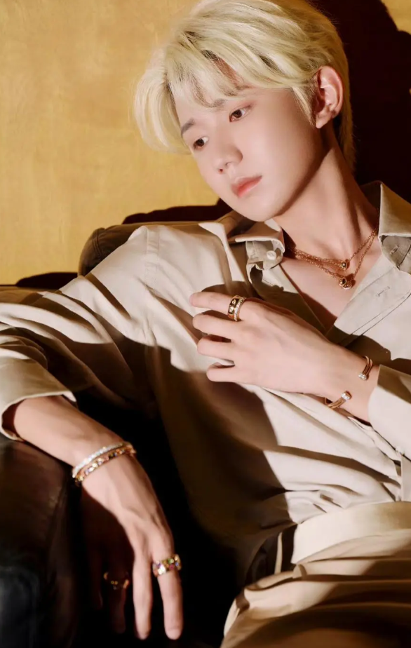 王源出席Pomellato宝曼兰朵直播造型图集大片出炉。 王源身着香槟色一粒钮西