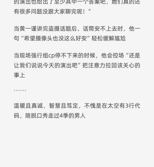 比起主持人证,庞博喜单的这些话更有含金量 这两天因为某大局观的原因,突然多了对两个脱口秀节目主持人的讨论。不拉一踩一,仅就庞博在喜单2的这些话就足以圈粉: 当房主任说完自己的经历,他温暖回应:“谢谢房主任,代表我们的姐姐、母亲、外婆给我们表演这段脱口秀,希望你接下来能做脱口秀的女儿,让脱口秀好好保护你” 当王越说完痛经的感受,他自知无法感同身受更体现其共情能力“谢谢王越的形容让我仿佛感受到了痛经是什么感觉,但其实我还是不知道它真正是什么感觉,因为没有人真的抬着我去撞树,所以有些事知道就是知道,不可能知道就是永远也不知道” 当马东问庞博三个超级优秀的人里投票会投给谁,他不会端水糊弄而是真诚回应:“大家都优秀但从我个人的观感喜欢xx。我不解释原因,我们的观众有权利不解释原因地给出自己的投票” 当网上说女性话题过多时,他敢于表达自己的立场:“总有人在问我们这些女演员朋友们总在谈论自己作为一个女性如何如何,我觉得今天好多朋友的演出也给出了至少其中一个答案吧,她们真的还有很多问题没跟大家聊完呢!” 当黄一谨讲完盗摄话题后、话筒安不上去时,他一句“希望摄像头也没这么好安”轻松缓解尴尬 当现场强行组cp停不下来的时候,他会控场“还是让我们说说今天的演出吧”把注意力拉回该关心的事上 …… 温暖且真诚、智慧且笃定,不愧是在太空有3行代码,陪脱口秀走过4季的男人