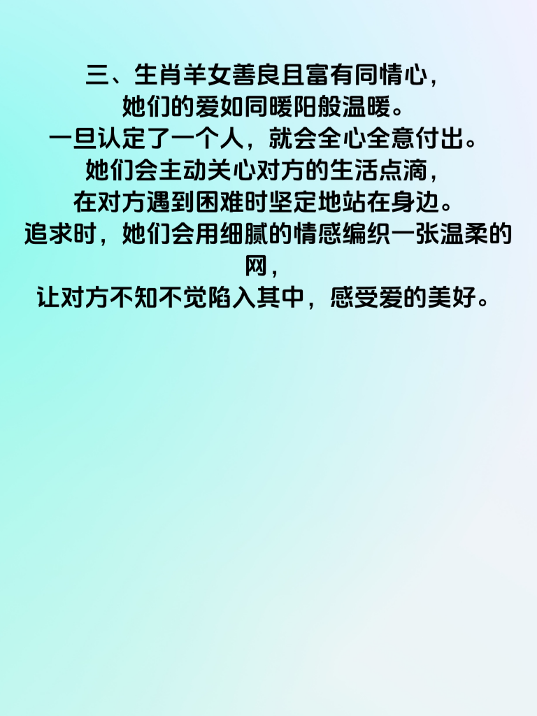 一、在爱情的世界里,有些生肖女展现出了令人惊叹的倒追指数,她们对爱的理解深刻,总能勇敢地追求自己的幸福。其中,有三大生肖女最为突出,她们最懂爱,值得我们深入了解。 二、生肖兔女温柔细腻,内心充满了对爱的渴望。她们善于观察对方的需求,能在细微之处给予关怀。当遇到心仪之人时,她们不会羞涩退缩,而是会巧妙地制造相处机会,用温暖和真诚慢慢打动对方。比如,精心准备一份对方喜欢的小点心,在不经意间送到他面前,开启甜蜜的互动。 三、生肖羊女善良且富有同情心,她们的爱如同暖阳般温暖。一旦认定了一个人,就会全心全意付出。她们会主动关心对方的生活点滴,在对方遇到困难时坚定地站在身边。追求时,她们会用细腻的情感编织一张温柔的网,让对方不知不觉陷入其中,感受爱的美好。 四、生肖蛇女聪明睿智,有着独特的魅力。她们在爱情中很有主见,懂得把握时机。面对喜欢的人,她们会巧妙地展示自己的优势,吸引对方的目光。不会盲目冲动,而是冷静分析,用智慧和魅力一步步靠近对方的心,让爱情之花悄然绽放。