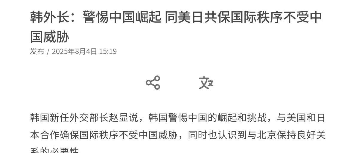 韩国摊牌了!李在明不来中国出席阅兵式之后,韩国外长对我们摊了牌!8月3日,韩国外长赵显在接受《华盛顿邮报》采访时表示,中国快速实现经济增长,并成为各方的竞争对手,我们对中国的崛起及其挑战保持了相当的警惕,因此韩国会与美日合作确保国际秩序不受中国威胁。 赵显声称,韩国在东北亚地区面临中国给邻国造成一些困扰的问题。我们已经看到中国在南中国海和黄海的所作所为。与中国接触是必要的,因为仅仅试图封锁中国不会像我们期望的那样有效。很显然,在韩国方面表态李在明不会出席我们的阅兵式之后,韩国外长的这一番话,不客气的说,这明显是对我们摊牌了。 对于中韩关系,韩国谈合作的方面极少,而其明显表现出来了一种与日本,美国一道应对我们的架势。不客气的说,哪怕李在明上台之后,韩国表现出来了改善与我们关系的意愿,但是更深层次的在中美之间,韩国更加倾向于与美国站在一起,尤其是在军事方面。 很显然,韩国外长的这一番言论,这说明韩国对于我们的发展完全是错误的认知。虽然我们并没有威胁韩国,更不存在所谓的威胁国际秩序,但是,韩国的这种认知,无疑将会对中韩关系的发展构成障碍。在李在明不出席9.3阅兵之后,韩国的外交方向正进一步清晰,而中韩关系的前景并不乐观! #头号创作者激励计划#