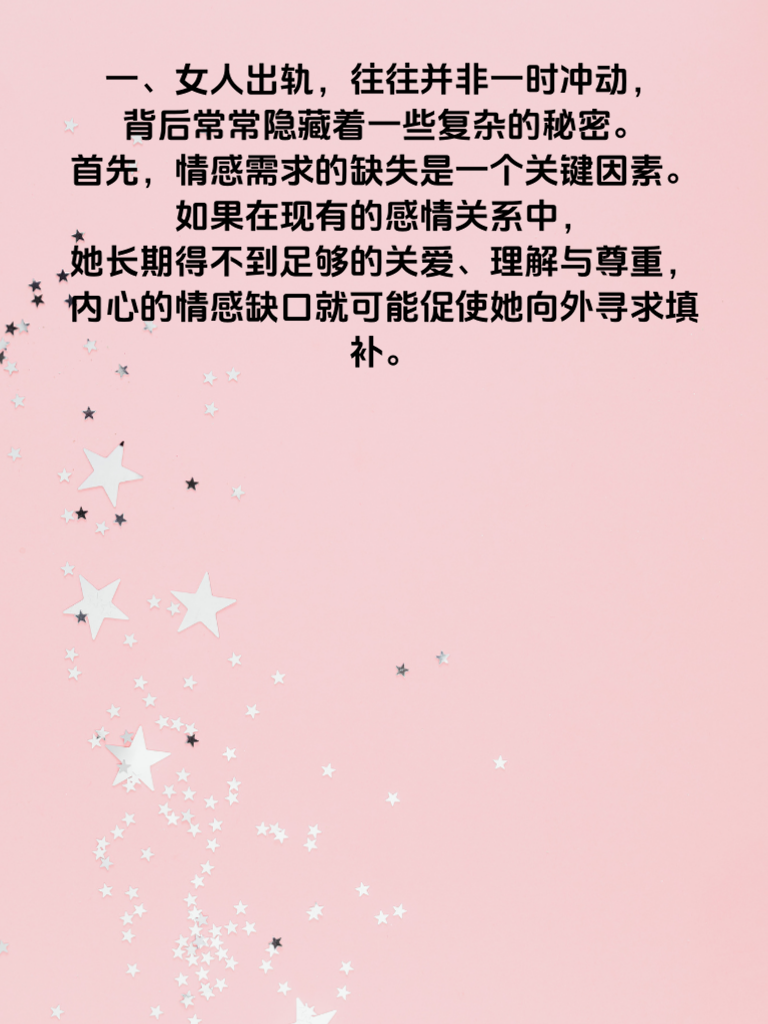 一、女人出轨,往往并非一时冲动,背后常常隐藏着一些复杂的秘密。首先,情感需求的缺失是一个关键因素。如果在现有的感情关系中,她长期得不到足够的关爱、理解与尊重,内心的情感缺口就可能促使她向外寻求填补。 二、夫妻间沟通的不畅也是重要原因。当双方无法坦诚地交流彼此的想法、感受和需求时,误解与隔阂会逐渐加深。这种情况下,女人可能会觉得自己在婚姻中孤立无援,从而更容易被外界能给予她情感回应的人吸引。 三、还有可能是对平淡生活的厌倦。日复一日的柴米油盐,缺乏激情与新鲜感,会让她渴望不一样的体验。而出轨,在她看来或许是打破这种平淡的一种方式。男人要明白,婚姻需要用心经营,关注女人的情感需求,保持良好的沟通,不时为生活增添乐趣,才能减少这类问题的发生,守护好两人的感情。