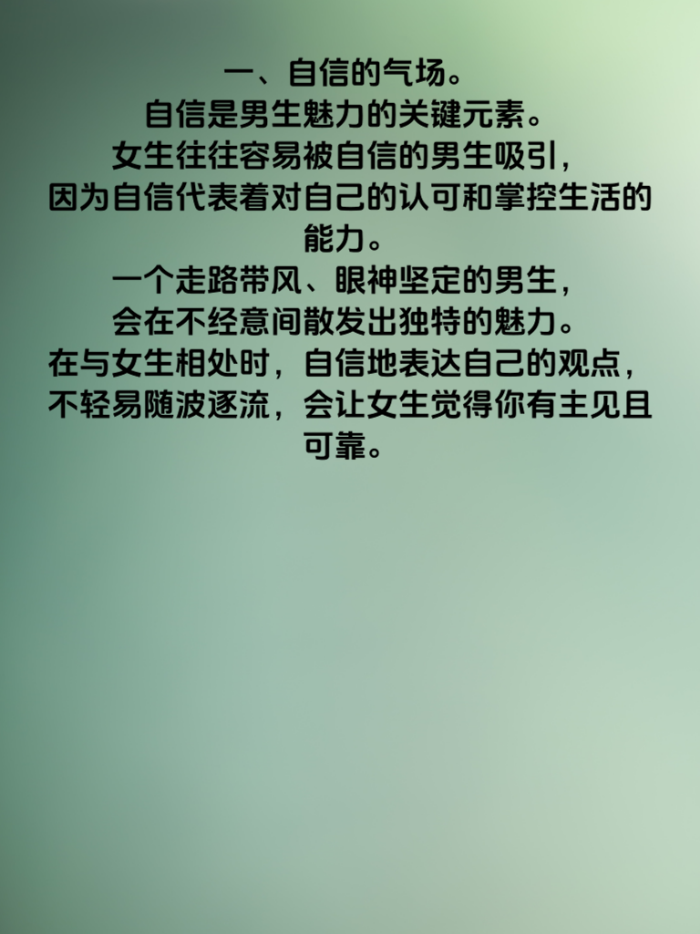 一、自信的气场。自信是男生魅力的关键元素。女生往往容易被自信的男生吸引,因为自信代表着对自己的认可和掌控生活的能力。一个走路带风、眼神坚定的男生,会在不经意间散发出独特的魅力。在与女生相处时,自信地表达自己的观点,不轻易随波逐流,会让女生觉得你有主见且可靠。 二、幽默的谈吐。幽默是人际关系的润滑剂,在追求女生过程中更是如此。会讲笑话、能适时调侃自己的男生,总能轻松营造愉快的氛围。幽默不仅能化解尴尬,还能让女生感受到你的高情商和亲和力。比如约会时,一句恰到好处的玩笑,能瞬间拉近你们的距离,让相处变得更加有趣。 三、专注的倾听。女生大多希望被理解和关注,所以懂得倾听的男生很加分。当她分享生活点滴时,认真倾听,给予她眼神回应和适当反馈,让她知道你在乎她的感受。这会让女生觉得自己被重视,从而对你产生好感。 四、真诚的态度。真诚是打动人心的法宝。在追求女生时,不玩套路,真心对待她,关心她的喜怒哀乐。用实际行动表达你的心意,远比甜言蜜语更能让她心动。真诚能让女生感受到你的真心实意,从而愿意敞开心扉接纳你。