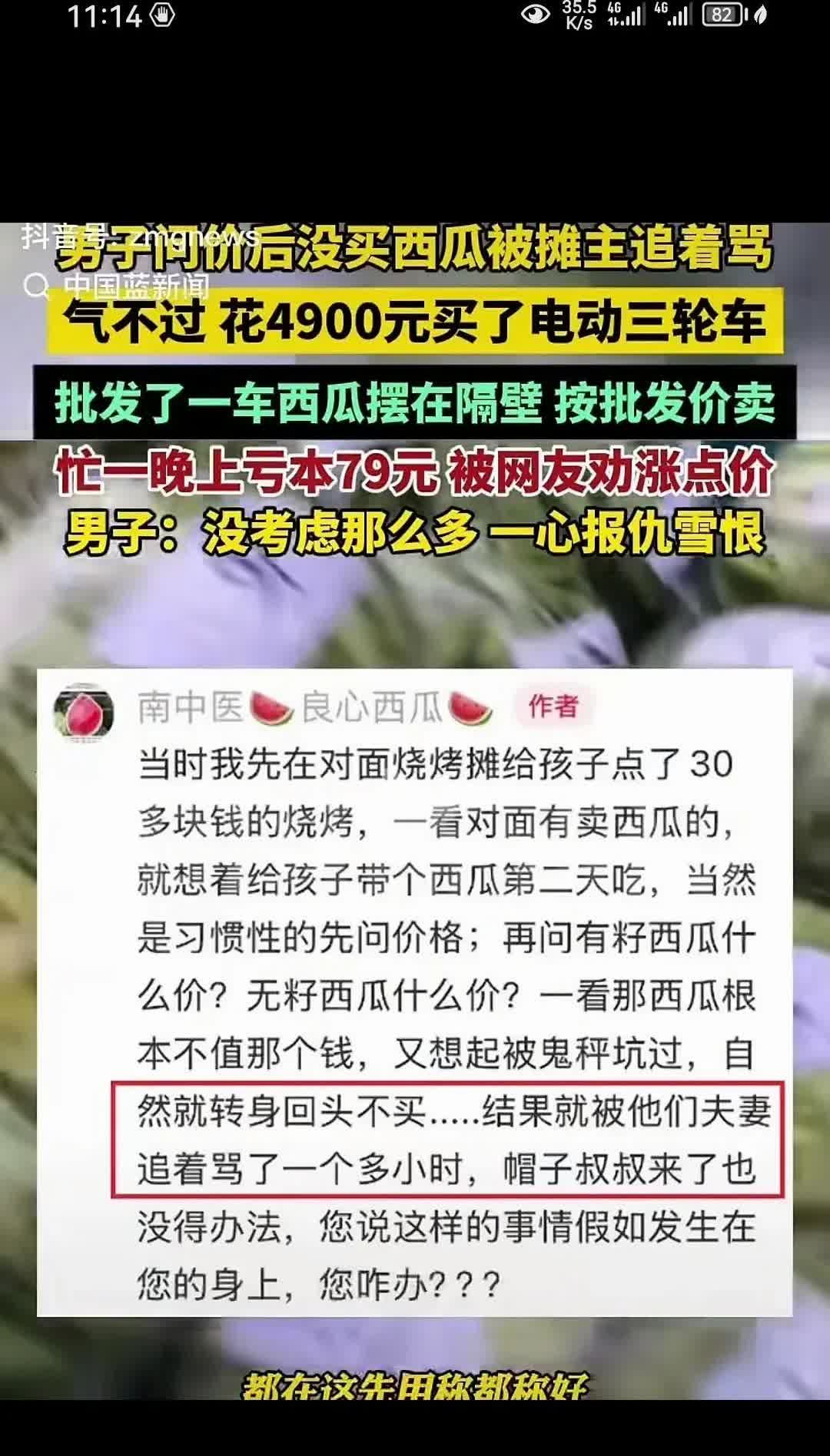 近日,在江苏南京发生了一件令人啼笑皆非的事。 一男子路过卖西瓜的摊位问了一下西瓜的价格,然后没买就走了,结果被卖西瓜的追着骂了一路。男子气愤不过就花4900元买一辆三轮车,然后批发了一车西瓜,就在那个骂他的摊位旁边批发价卖,忙了一晚上,赔了79块钱[捂脸]。 不过,男子一点儿也不后悔,虽然赔钱了,但出气了[笑哭],对于男子来说,恐怕这才是最重要的。 俗话说的好:人争一口气,佛受一炉香。气要争,钱也要赚呢!否则赔钱卖吆喝了! 虽然说这是生活中的一出小闹剧,但也折射出现如今国民心态的变迁,一心向钱,人的心态必然会变。古语有云:和气生财!恶语相向招来的必定是横祸。 人呐,还是和气一点好!无论做什么,笑脸儿相迎,总会给人一阵温暖,一片阳光。