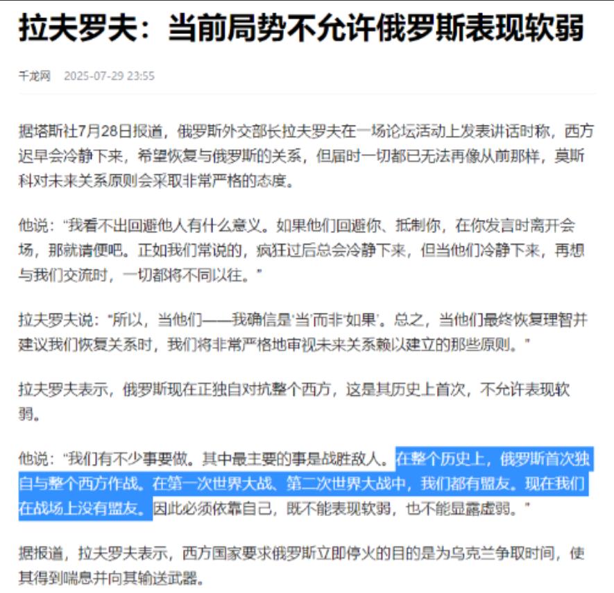 拉夫罗夫这话一出口,等于彻底捅破了窗户纸:俄罗斯已经被全球孤立到只剩自己,所谓的“战略伙伴”,以为坚固的“联盟”,到动真格的时候,一个个溜得比谁都快! 麻烦看官老爷们右上角点击一下“关注”,既方便您进行讨论和分享,又能给您带来不一样的参与感,感谢您的支持! 俄罗斯在全球舞台上的孤立感愈加明显,近年来,随着俄乌冲突的不断升级,俄罗斯的外交处境变得愈发困难,曾经的盟友关系也日渐疏远。 俄罗斯外交部长拉夫罗夫的一番话,无疑揭开了这一现象的冰山一角,他公开承认,俄罗斯已经被全球孤立,失去了过去作为大国的影响力和广泛的国际支持,这一表态反映了俄罗斯在当前国际局势中的孤立困境,也暴露了其在与西方国家对抗中的深刻焦虑。 拉夫罗夫的言论并非空穴来风,纵观俄罗斯近年来的外交政策,虽然其依旧能够依赖某些国家的支持,但这种支持显然不足以改变当前的国际形势。 白俄罗斯、朝鲜、伊朗等国是俄罗斯在这一局势中的“支持者”,但这些国家的实力有限,远无法与西方世界的强大支持相抗衡。 白俄罗斯虽然地理位置接近,且与俄罗斯保持相对亲近的政治关系,但其经济和军事能力远不足以为俄罗斯提供实质性的帮助,朝鲜和伊朗的支持也同样受限,尽管它们在军事领域对俄罗斯有所援助,但其资源和技术远不能与西方提供的支持相匹敌。 这种情况与俄罗斯的历史背景形成了鲜明的对比,拉夫罗夫提到,俄罗斯曾在第一次和第二次世界大战期间拥有广泛的盟友支持,无论是在对抗纳粹德国的战争中,还是冷战时期与西方对抗时,俄罗斯(当时是苏联)都能依靠盟友的支持来巩固其国际地位和战略优势。 特别是在冷战时期,苏联与许多社会主义国家和第三世界国家建立了深厚的关系,这些国家不仅提供了外交支持,还在军事、经济等领域给予了实质性的援助。 今天的俄罗斯却发现,随着国际形势的变化,其过去的盟友关系几乎完全瓦解,特别是在乌克兰危机爆发后,俄罗斯几乎无法依赖任何一个能在国际上为其撑腰的大国。 与俄罗斯的孤立不同,西方国家对乌克兰的支持却持续不断,自冲突爆发以来,西方国家尤其是美国、欧盟成员国,给予了乌克兰大量的援助,包括资金、武器和军事技术支持。 这些援助使乌克兰能够在对抗俄罗斯的过程中维持较强的抵抗力,并在某些战场上取得了关键的胜利,西方的支持不仅仅是物质层面的,更在心理上给予了乌克兰强大的信心,让这个国家在与俄罗斯的斗争中始终未曾放弃。 相比之下,俄罗斯的盟友力量几乎无法对抗西方提供的援助,俄罗斯在这场战争中的处境可谓是四面楚歌,拉夫罗夫的发言,除了描述俄罗斯当前的外交困境,还可以看作是对当前局势的愤怒宣泄。 作为外交部长,他深知俄罗斯在国际舞台上的孤立已是事实,所有的外交努力似乎都未能改变这一状况,即使俄罗斯试图通过军事力量和外交手段来寻找突破口,然而西方国家的态度依然坚定,并且普遍采取了不妥协的立场。 拉夫罗夫或许已经意识到,即使俄罗斯继续加大军事打击,西方的支持和援助也不会停止,俄罗斯缺乏能够与西方匹敌的强大盟友,这使得其在国际关系中始终处于被动的局面。 从拉夫罗夫的言辞中可以看出,俄罗斯的失望和绝望情绪已经深深植根于其外交政策的核心。这不仅仅是一次外交发言,而是俄罗斯对当前困境的真实反应。 在过去的几年中,俄罗斯不断试图通过强硬的外交和军事手段来改变局面,但其所依赖的传统盟友已经消失殆尽,世界政治格局的变化使得俄罗斯难以寻找有效的支持者。 即使白俄罗斯、朝鲜和伊朗等国表态支持,俄罗斯依旧发现它无法在全球范围内找到一个足以与西方对抗的“战略伙伴”。 俄罗斯的全球孤立并非一朝一夕形成的,而是在长期的外交政策失败和国际态势变化中逐步积累的结果,如今,拉夫罗夫的言辞代表了俄罗斯在国际外交舞台上的无奈和愤怒。 随着西方国家的联合支持,乌克兰在与俄罗斯的战争中逐渐占据了上风,而俄罗斯却无法有效打破西方的援助封锁,未来,俄罗斯是否能够找到新的盟友来突破这种孤立局面,仍然是一个无法预测的课题。 对于拉夫罗夫所说的“绝望”,我们不难看出,俄罗斯在面临西方的全面封锁和孤立时,已经无法再像过去那样通过单独行动来改变局势。 这个现象不仅展示了俄罗斯在外交上的失败,也反映了全球化进程中大国之间权力对比的激烈变化。 西方国家通过联合行动有效地孤立了俄罗斯,而俄罗斯却没有能够有效反制的手段,这为国际关系中的小国提供了一个重要的警示——在大国博弈中,背后强大的盟友支持往往是决定胜负的关键因素。