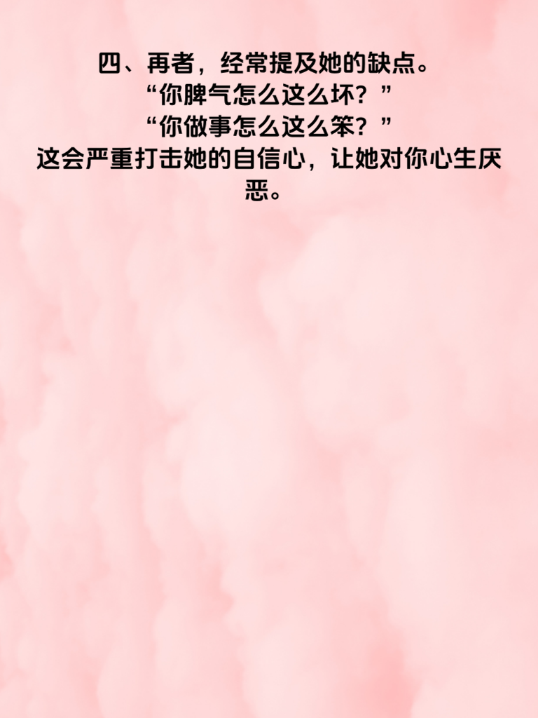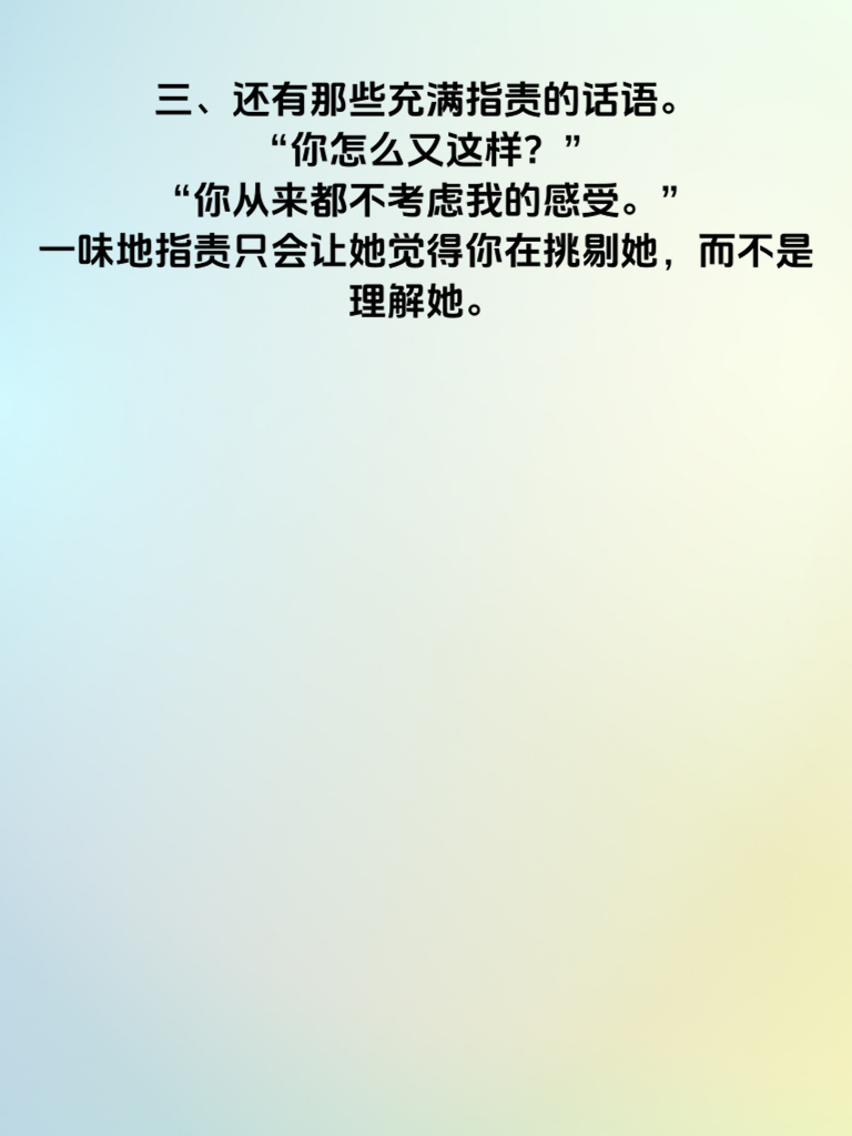 一、在男女相处中,语言的力量不容小觑。有些话,对于不在意你的女人来说,就像一把把利刃,能瞬间刺痛彼此的关系。 二、比如,总是不停地追问她的行踪。“你去哪儿了?和谁在一起?”这种过度的关心在她看来可能只是一种束缚,她会觉得你在限制她的自由,从而对你更加反感。 三、还有那些充满指责的话语。“你怎么又这样?”“你从来都不考虑我的感受。”一味地指责只会让她觉得你在挑剔她,而不是理解她。 四、再者,经常提及她的缺点。“你脾气怎么这么坏?”“你做事怎么这么笨?”这会严重打击她的自信心,让她对你心生厌恶。 五、相反,我们应该学会用温和、理解的语言去交流。多一些赞美,少一些批评;多一些倾听,少一些追问。用爱和尊重去对待她,才能拉近彼此的距离,让她感受到你的真心。
