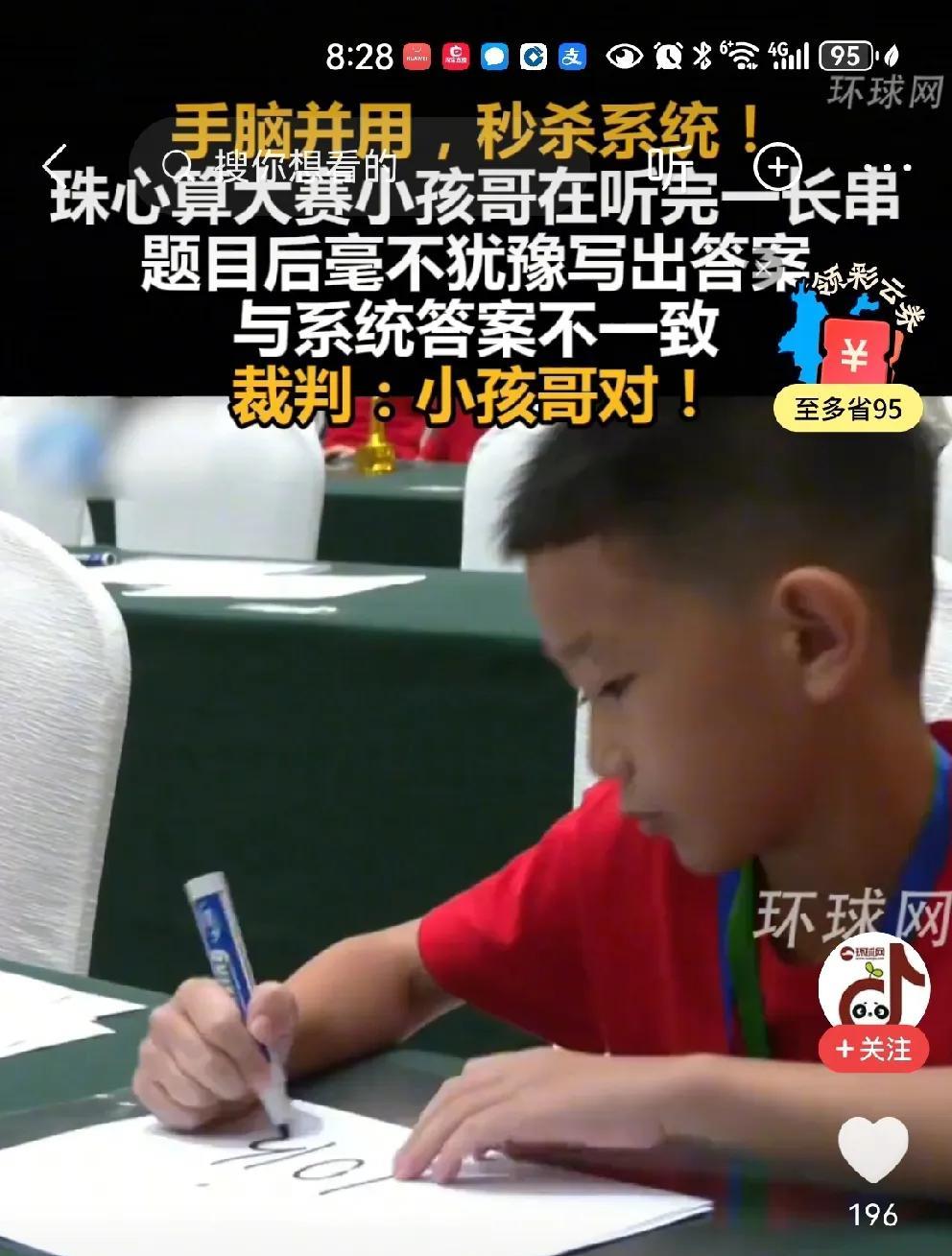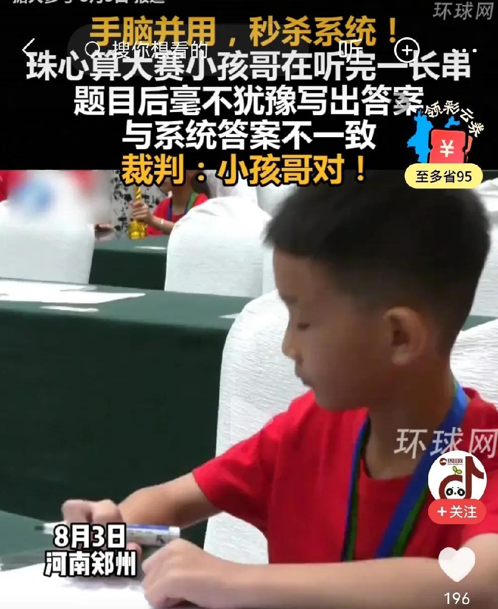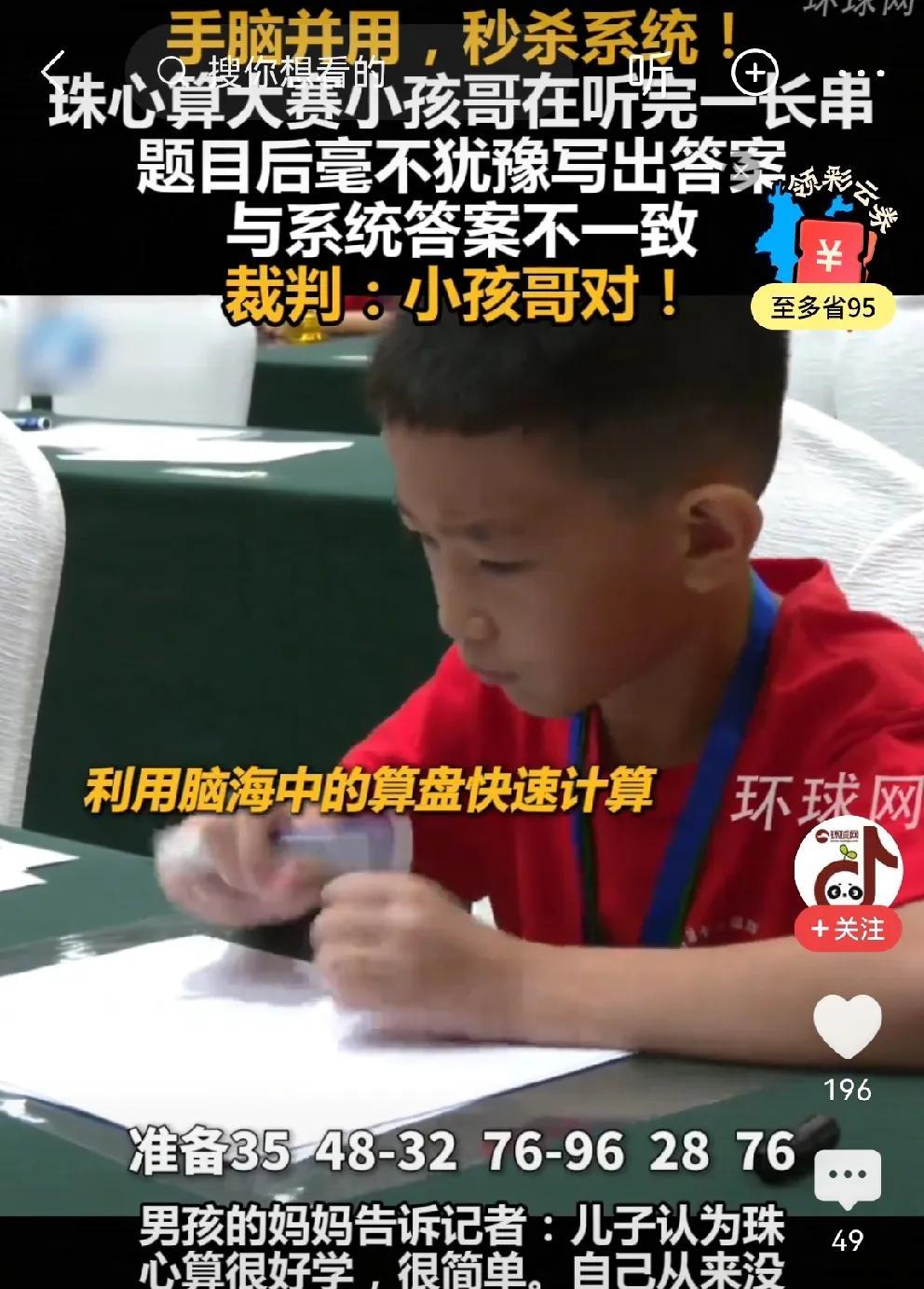 #珠心算大赛小孩哥手脑并用秒杀系统# 这小孩哥,珠心算能力赛过系统,太牛[给力]妈妈的凡尔赛,更牛[给力][给力] 8月3日,河南郑州举行儿童珠心算大赛 这孩子主持人口念一长串数字,而且越念速度越快… 只见小孩哥,聚精会神,手脑并用,利用脑海中的算盘快速计算…最后写下答案:1015 这时,系统报出1011。男孩说:不对不对,应该是1015 最后,经过核对,小孩哥正确。 小孩哥如释重负,露出来自豪的笑容。 妈妈告诉记者:儿子说珠心算很好学,很简单。自己从来没管过儿子学习,他一般读课文五分钟就记下来了。 听听,这小孩哥记忆力超强,过目不忘,数学天才[给力][给力][给力][给力] 这孩子的珠心算能力比系统强大,数学天才[给力][给力]未来可期[赞][赞][赞] #心算能力# #珠心算# 头号创作者激励计划#