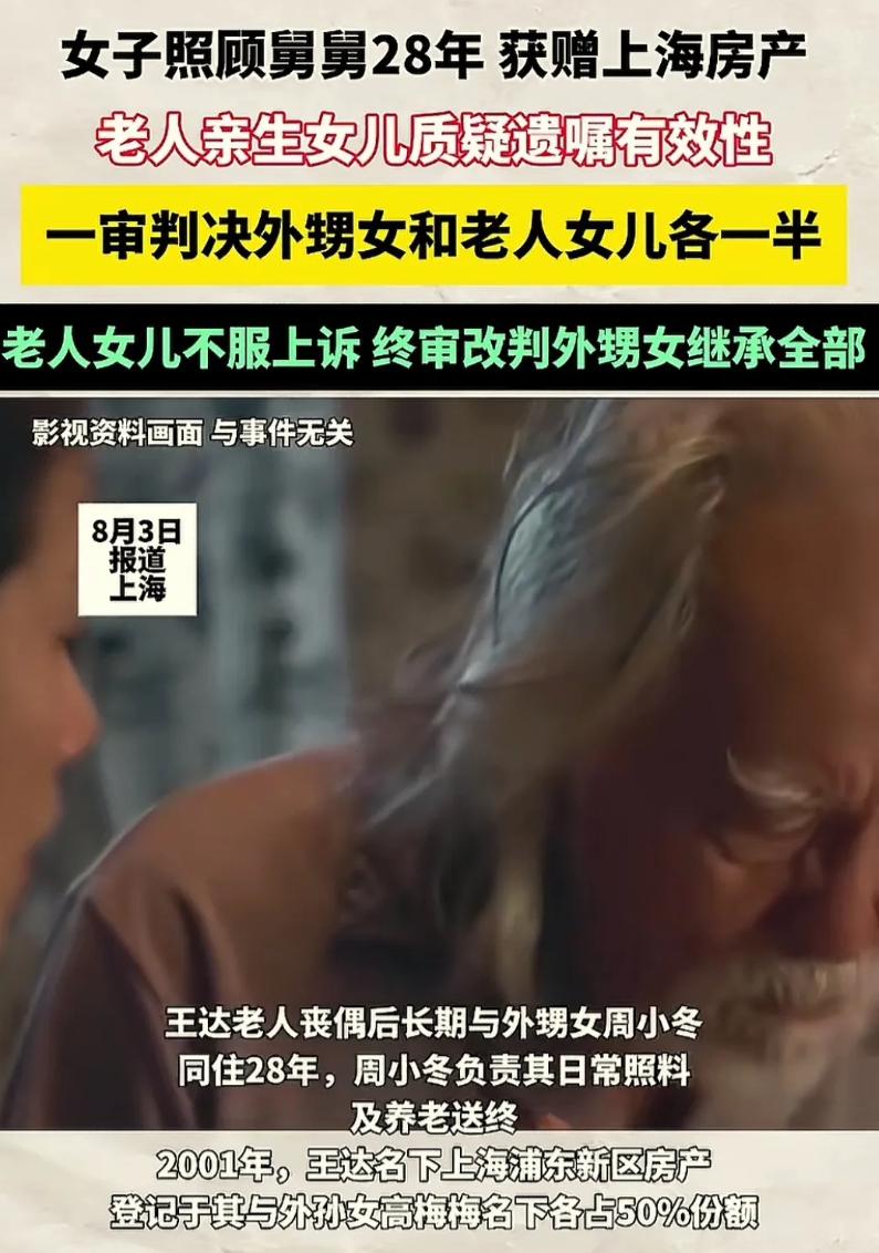 原来,王达立老人生前立下遗嘱,把自己在上海的一套房产留给了外甥女,女儿什么也没有,王晓知道后才立马回国抢财产。 一审法院审理后认为,虽然周小冬承担了主要赡养义务,但根据《继承法》相关规定,王晓作为第一顺序继承人享有法定继承权。2022年底,法院判决房产由二人各继承50%。 “这个判决等于否定了我所有的付出。”周小冬接到判决书时当场落泪,她立即提起上诉,翻出28年来的照料记录,提供了更详细的证据。