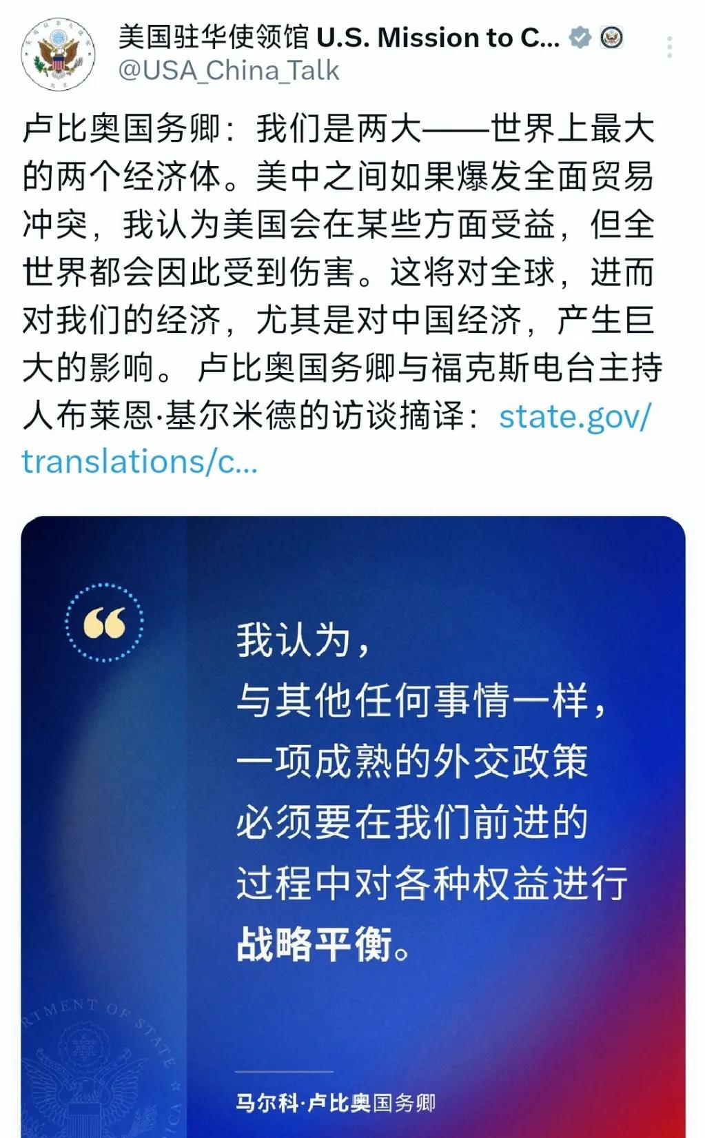 美国驻华使领馆今天(8月4日)写道:“卢比奥国务卿:我们是两大——世界上最大的两