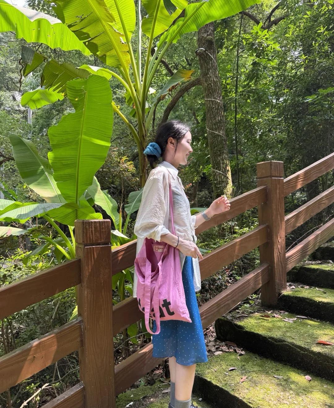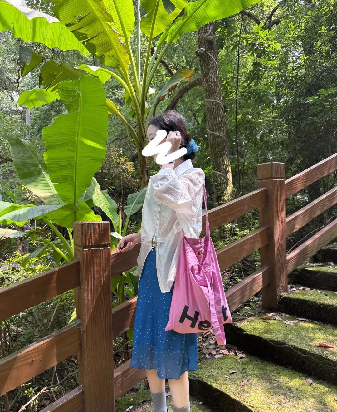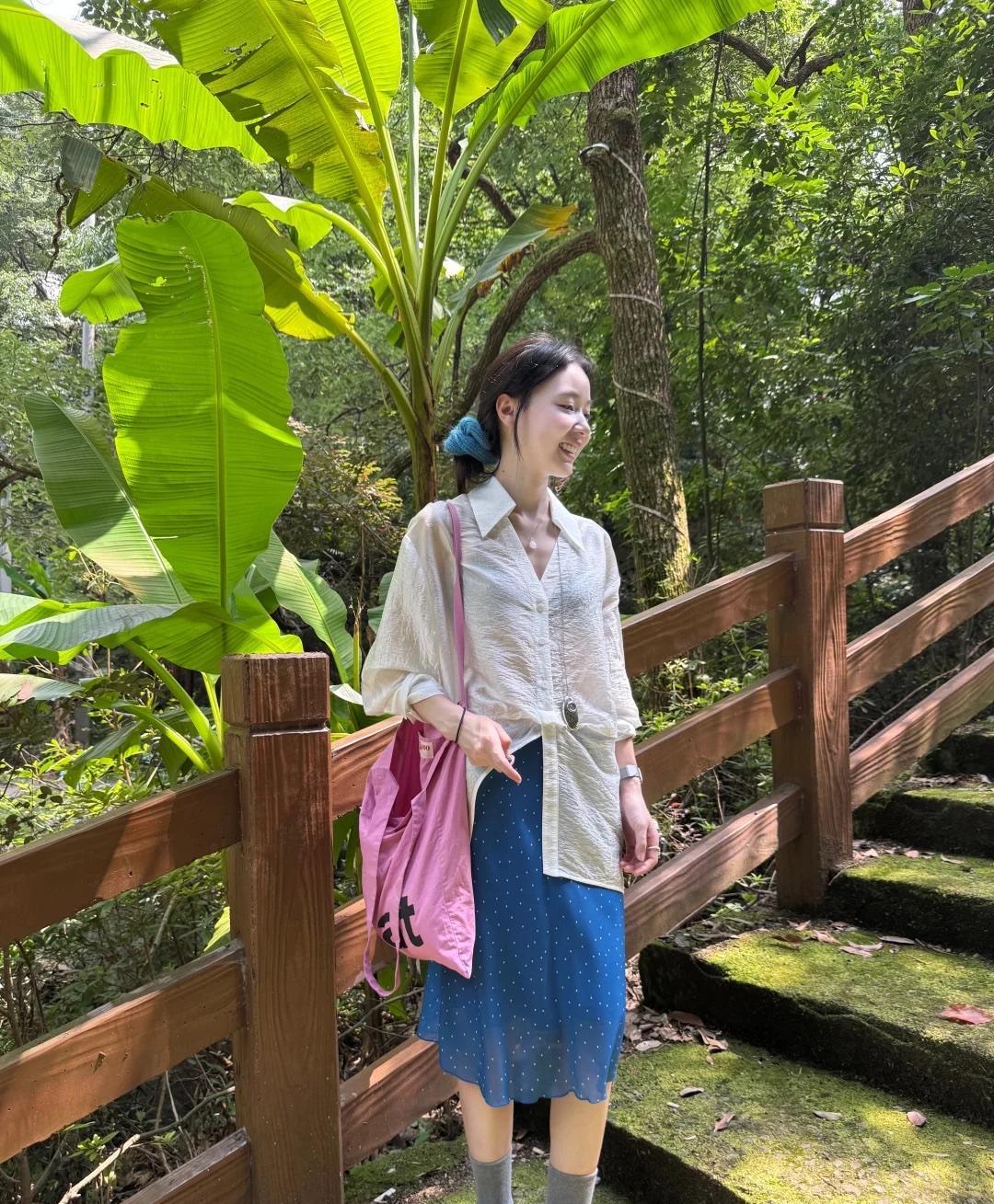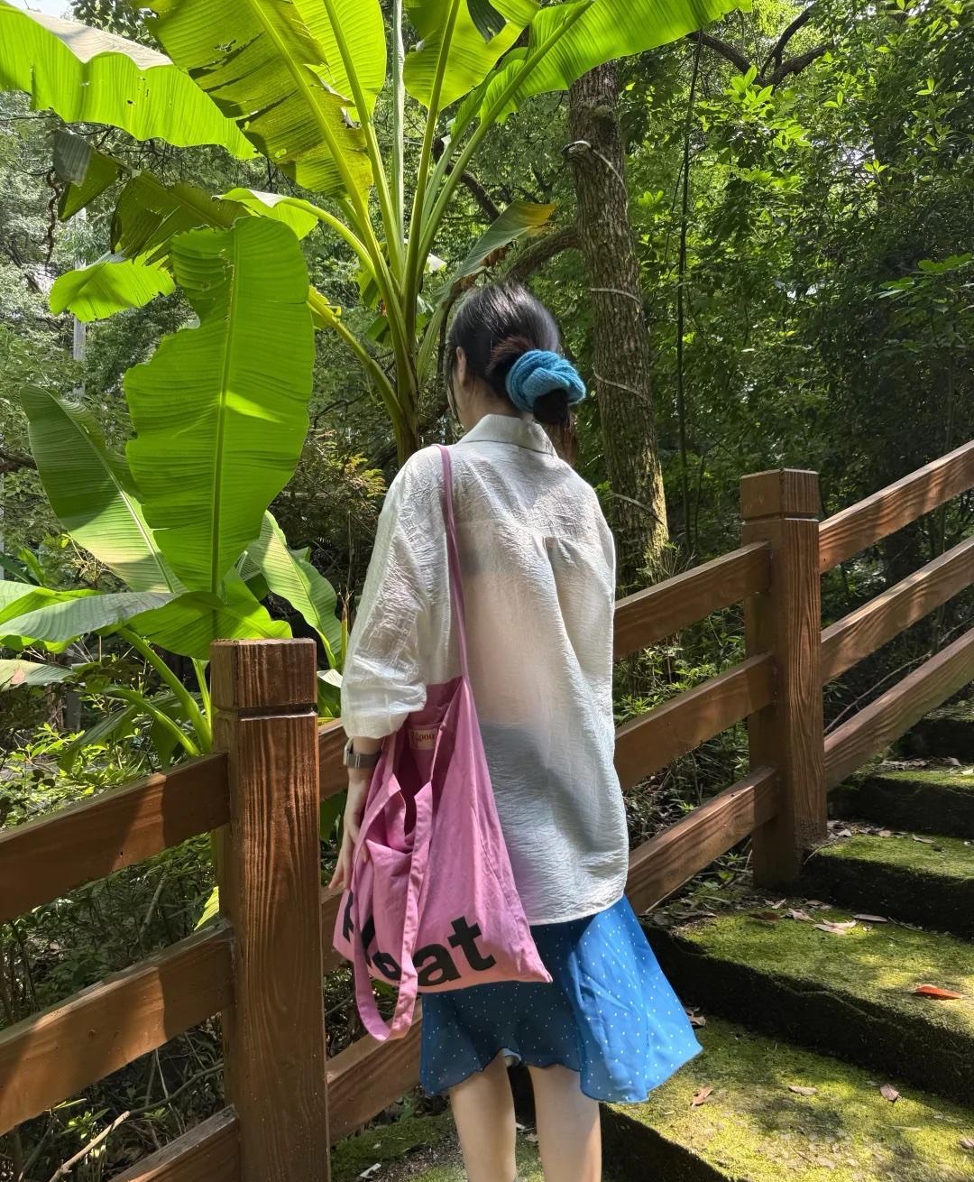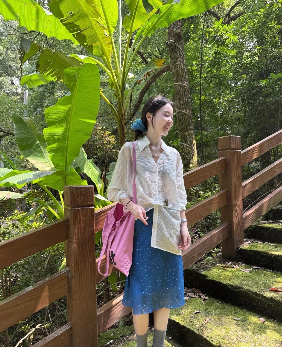 这样的配色超好看呀,清新又夏天!夏天白衬衫可以模仿这小姐姐的穿搭,轻薄微透的材质非常的轻盈,搭配一条蓝色的雪纺半身裙,再用粉色包包撞色提亮,更有夏日的甜美时尚感。