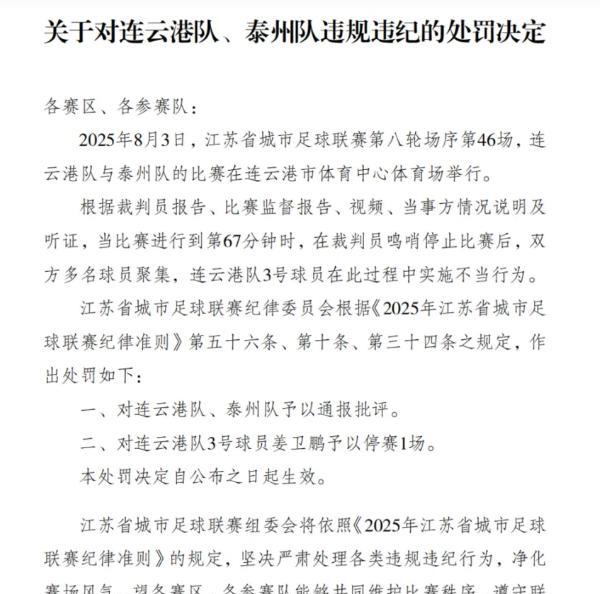 苏超联赛的连云港队和泰州队被通报批评 昨天苏超联赛的一场关键比赛,连云港队主场对阵泰州队,双方球员在场上因为一个犯规的问题发生了肢体冲突,此事也引发了支持不同球队的网友争论。 今天苏超联赛主办方拿出了处理情况通报,对连云港队和泰州队予以通报批评,对连云港队3号球员予以停赛一场处罚。 我觉得苏超联赛主办方这个处理结果是非常正确的,虽然双方球员在场上的肢体冲突没有演变成一场群体互殴事件,但这在众多关心苏超联赛的网友们看来,这个肢体冲突事件是对苏超联赛的良好声誉产生了非常不好的负面影响。 苏超联赛主办方能够在这个时候及时拿出处理结果,这就可以警示各个球队后面比赛已经要文明比赛,球场上的球员不能因为犯规问题而直接拳脚相加,而是要尊重裁判,由裁判来解决问题,苏超联赛是干净的比赛。